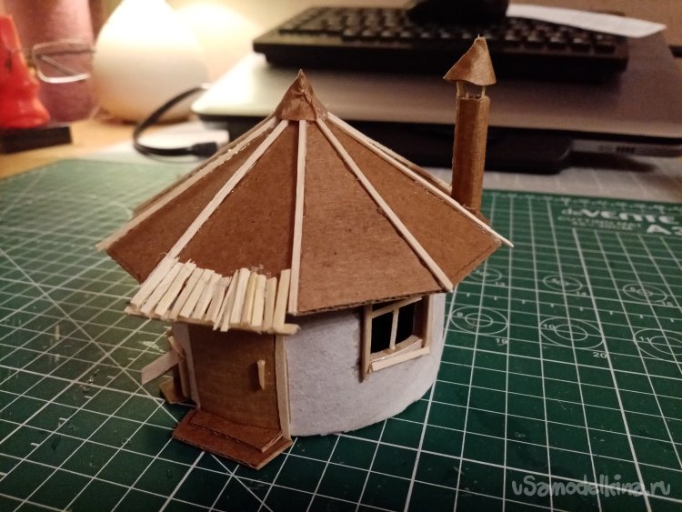 Приклеиваю входную дверь, козырек над ней. Из кусочков картона формирую завалинку.