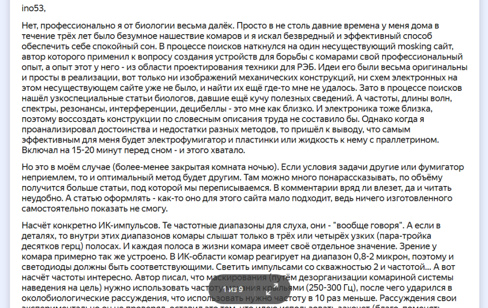 Немного теории. У комаров, как и у многих живых существ, есть сигнал тревоги. Типа «валим все отсюда, тут убивают». Дальше всё просто, подбирается частота этой тревоги для каждого конкретного вида живности. Иногда эта живность привыкает к этой частоте, и её требуется немного поменять. Спустя 14 лет, я думаю, есть аппараты, которые это делают сами. На форуме я развил целую тему, как избавиться от комаров на даче, мой способ мне больше всех понравился. Но тема в архиве, поэтому для прочтения скорее всего понадобится зарегистрироваться там.