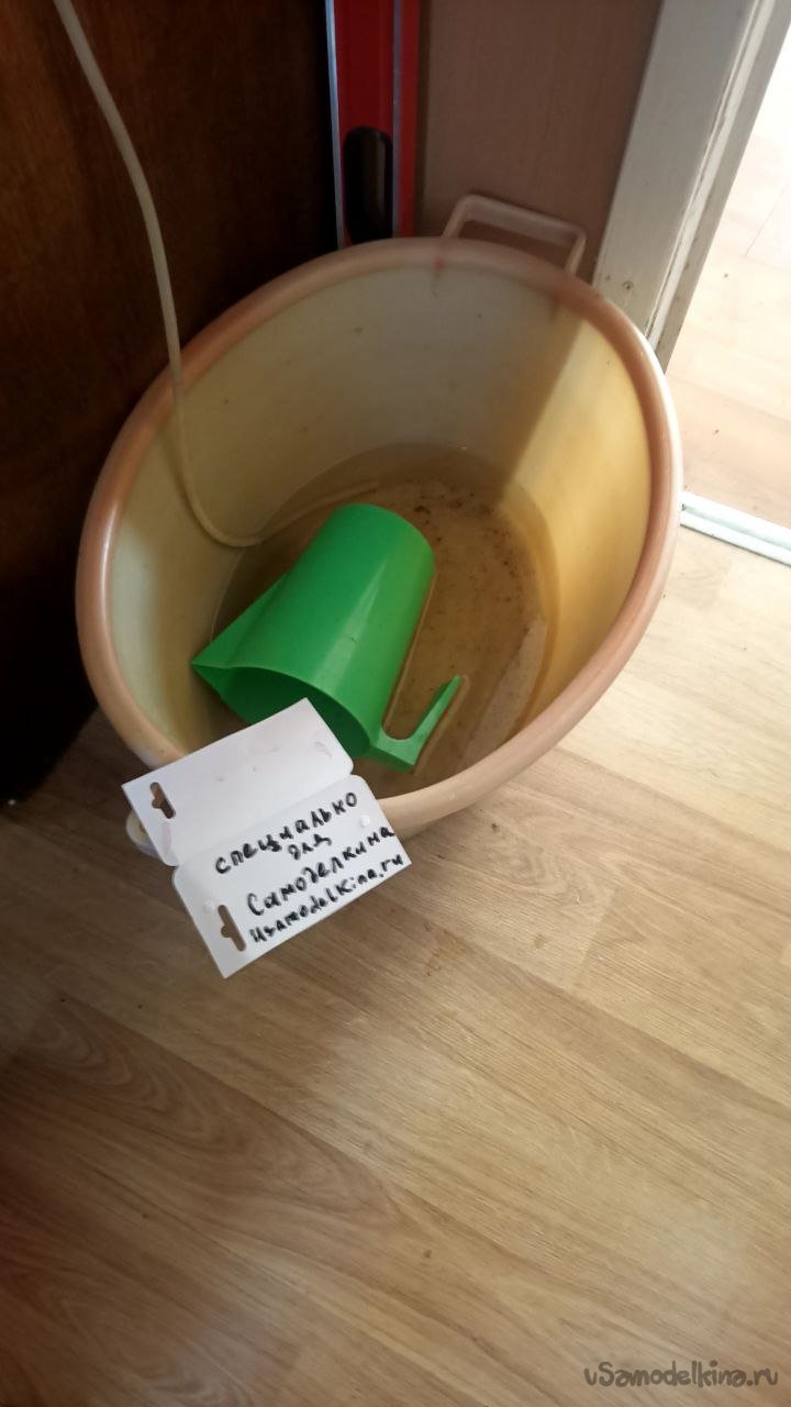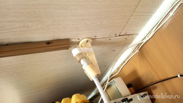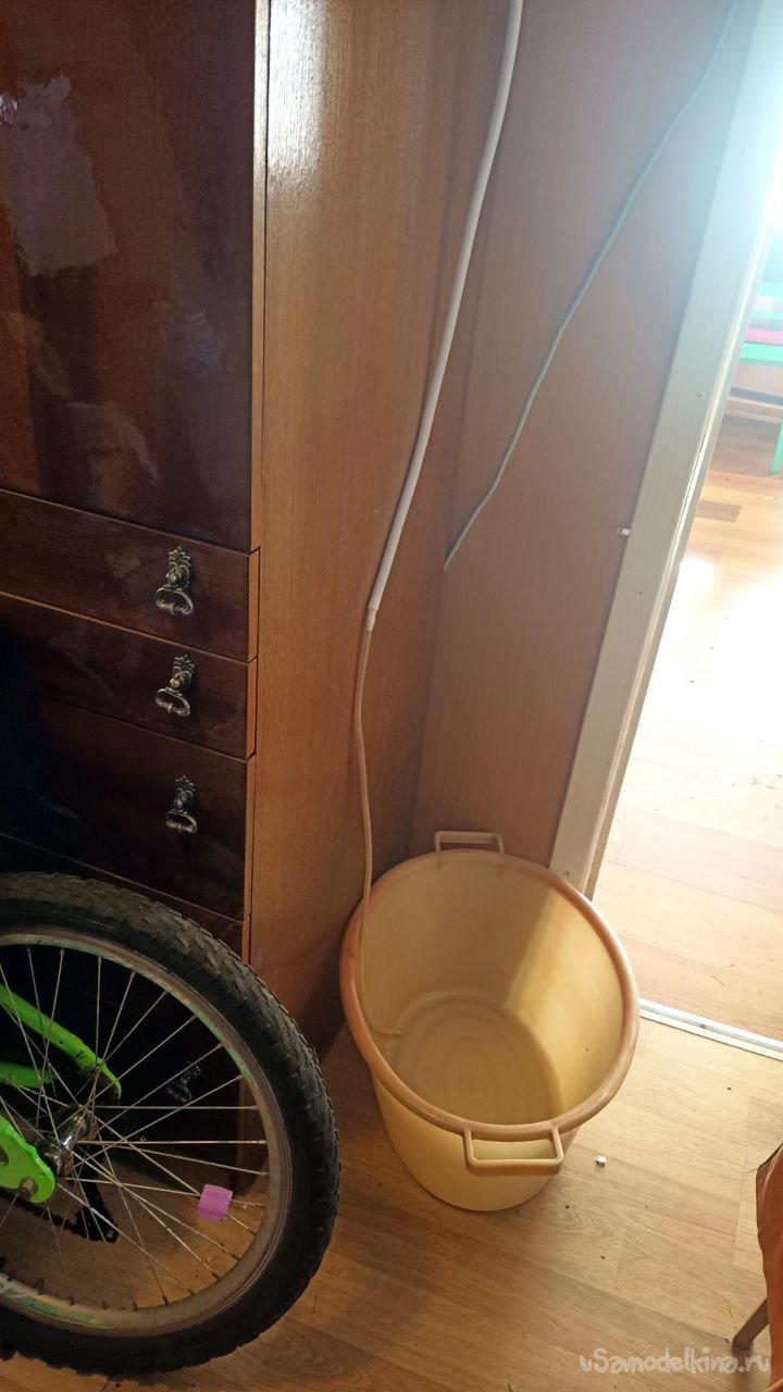 С помощью строительного уровня определяем, куда идёт наклон нашей крыши. С плинтуса снимаем кабель-канал, в образующуюся впадину и будет собираться водичка, и без разницы, из какого места вдоль щели она капает. Саморезами прикручиваем плинтус к потолку вдоль щели. Естественно, саморезы крутим не в центр плинтуса, а в края. Приделываем воронку в месте сбора воды. Жена настояла, чтобы не было брызг, к воронке приделать гибкий шланг нужного диаметра, шланг опускаем в тазик. Поскольку погода стояла хорошая, провели учения с помощью помпы, накачали воду в плинтус, она стекла, как мы и задумывали, прямо в тазик. Полгода использования подтвердили правильность выбранного решения. Может, чего и замерзало, так оно потом отмерзало, объёма тазика вполне хватило, чтобы вода не лилась на пол. Так что всё работает!