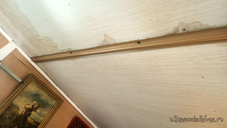 Мы хотели решить вопрос кардинально – заменить крышу полностью, но я всех убедил, что она неправильно сконструирована, и замена не поможет. Тогда жена сказала коронную фразу: «Ну ты же инженер, придумай что-нибудь». Пришлось взять пива и придумывать. В данном случае я решил бороться не с причиной, а с последствиями. Самый простой способ придумала жена – под места протечек она подставляла посуду в виде тазиков. Примерно тем же путём пошёл и я. Немного теории. Каким бы путём вода не попала, она потом ищет себе удобное место выхода, руководствуясь законом всемирного тяготения. Листы ДСП, из которых сделан потолок, имеют стыки. Наша дождевая вода нашла себе любимый стык, и всегда капает вниз, но периодически меняет точку выхода, не знаю почему, то ли земля при заморозке-разморозке меняет наклон дома, то ли другая причина, но этим надо воспользоваться. Что у нас есть в кладовке для такой акции? Правильно, пластиковый плинтус, который остался лишним лет пятнадцать назад и пылился все эти годы на складе.