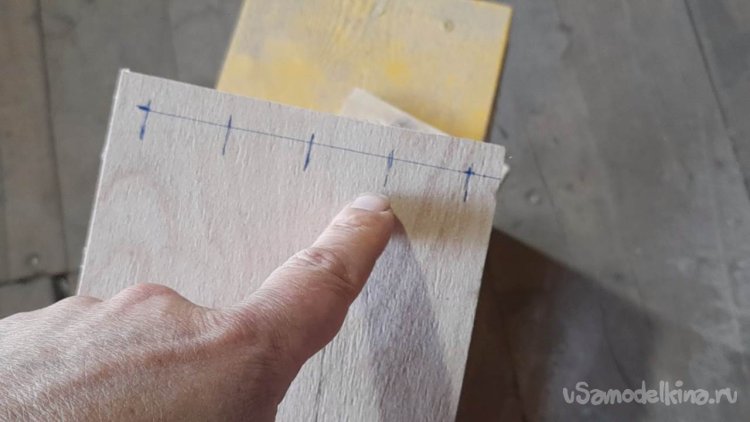 От края я сделаю метки с отступом в 1 см. Это с учетом того что толщина фанеры 6 мм.
