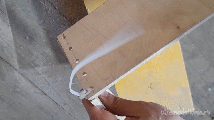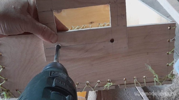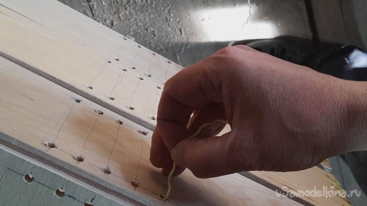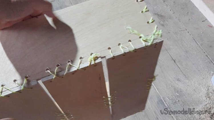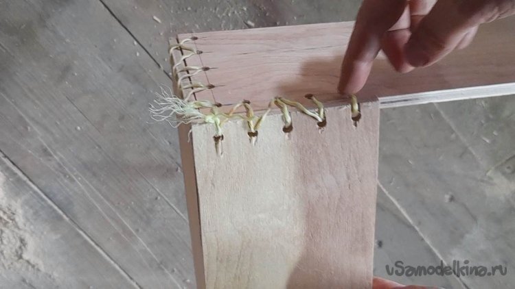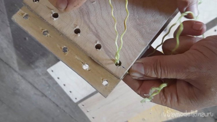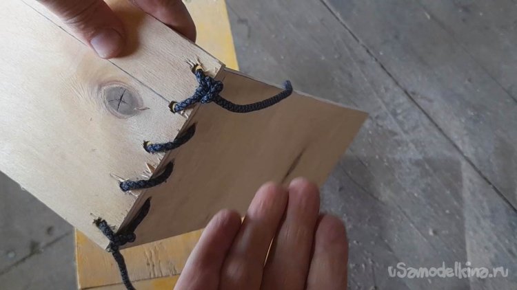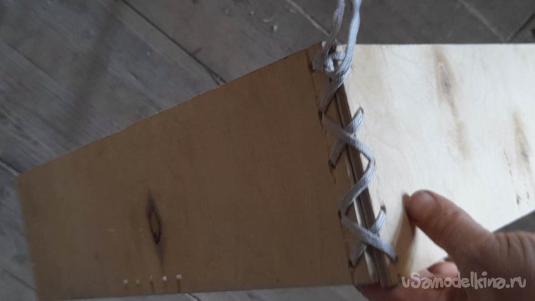 Скреплять 4 планки в каркас ящика я буду при помощи нейлоновой бечевки, продевая её через отверстия зигзагом в одну и потом в другую сторону.