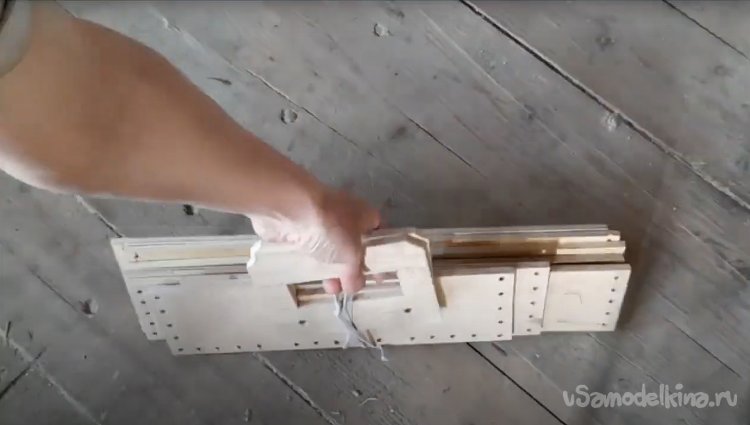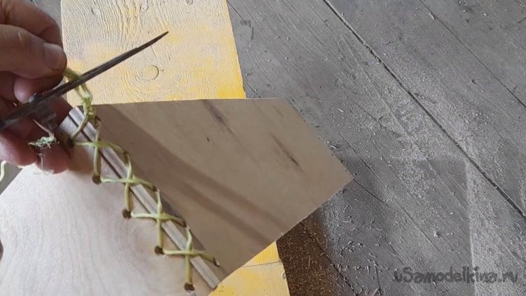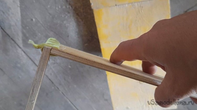 Скрепляю планки дна ящика с планками каркаса при помощи бечевки.