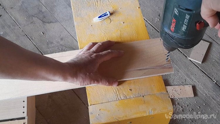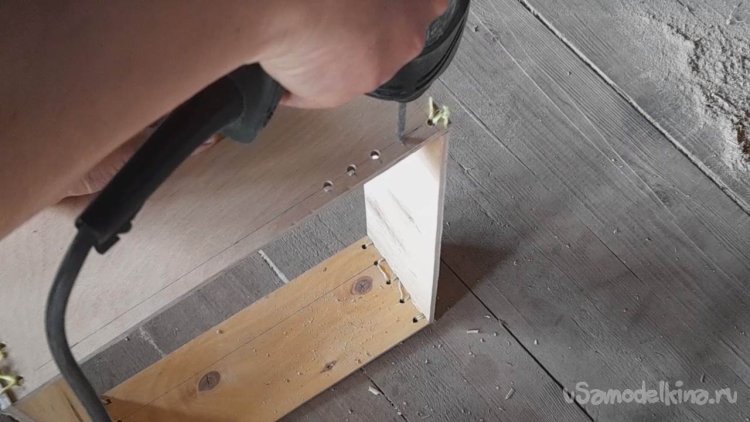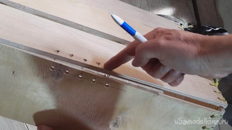 По краям планок дна ящика я помечаю и высверливаю отверстия аналогично тому как я делал у планок каркаса.