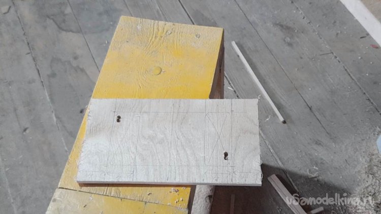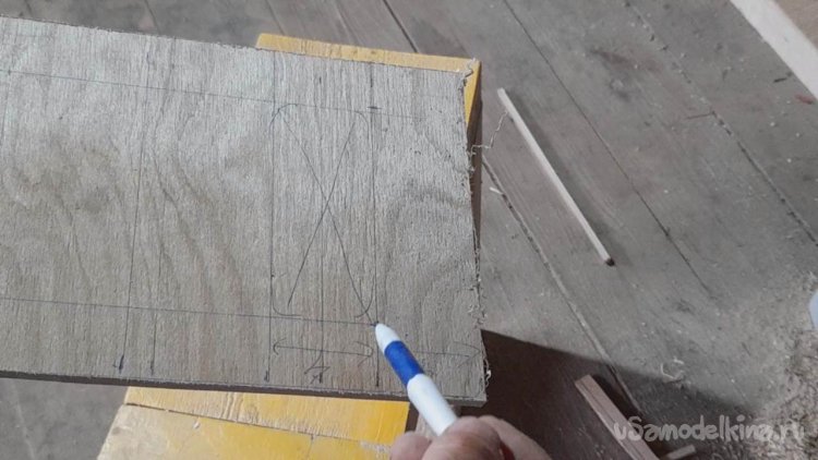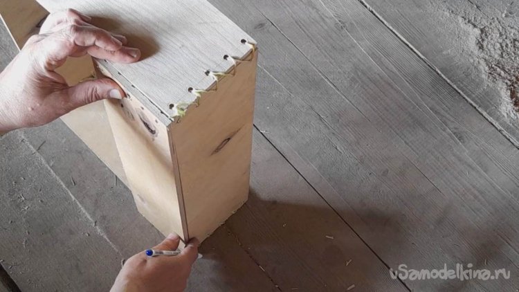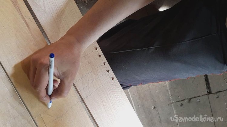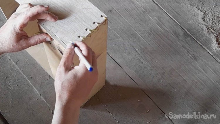 Ручкой делаю пометки для высверливания отверстий в планках каркаса через которые будет проходить крепление планок каркаса и планок дна ящика.