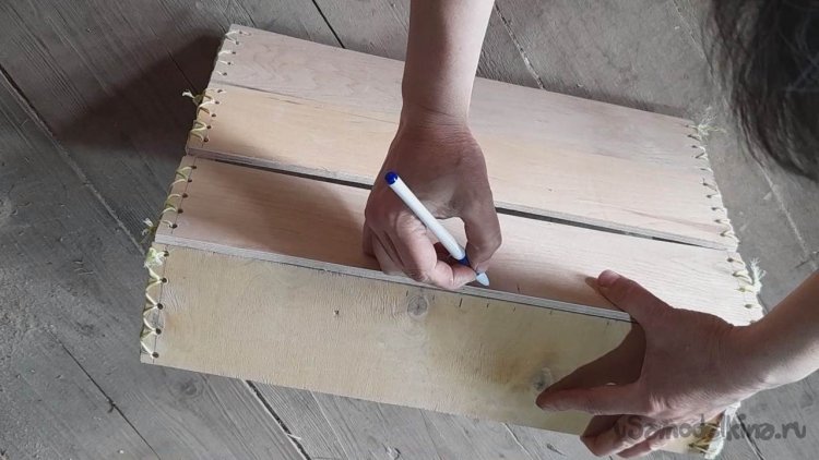 Поэтому необходимо закрепить планки дна ящика к каркасу при помощи отверстий и бечевки и по бокам ящика по середине,