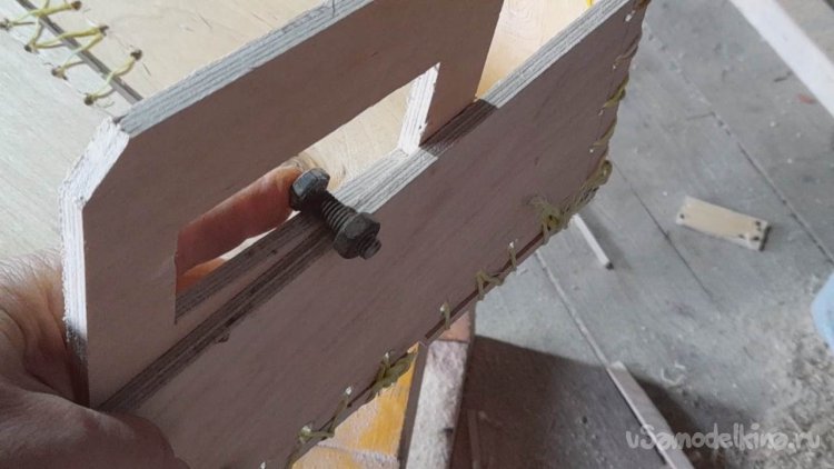 У нас толщина планки стенки ящика и ручки из фанеры будет составлять 12 мм в сумме, вот прибавим высоту гайки, где-то 15 - 20 мм должен быть болт по длине.