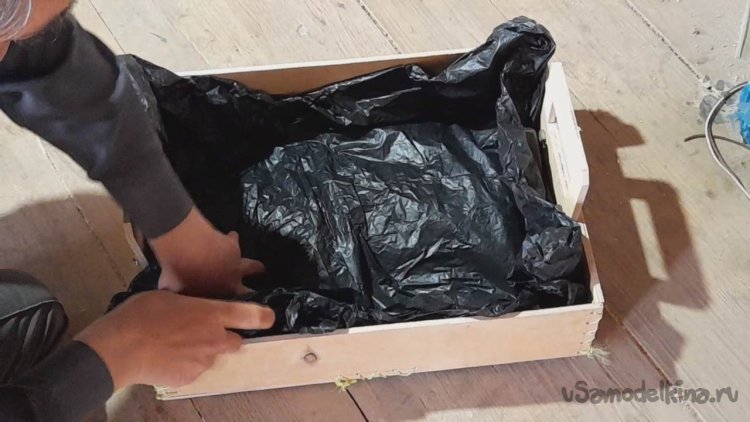 Так как я делал ящик для рассады, то я постелю большой мусорный пакет на дно ящика куда будет собираться лишняя влага вытекающая из стаканов с рассадой.
