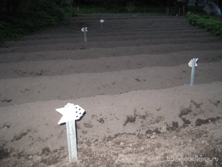 Ну, а белые пластиковые указатели очень хорошо видны на фоне земли и зелени, так что посадки разных сортов картофеля уже не перепутаешь.