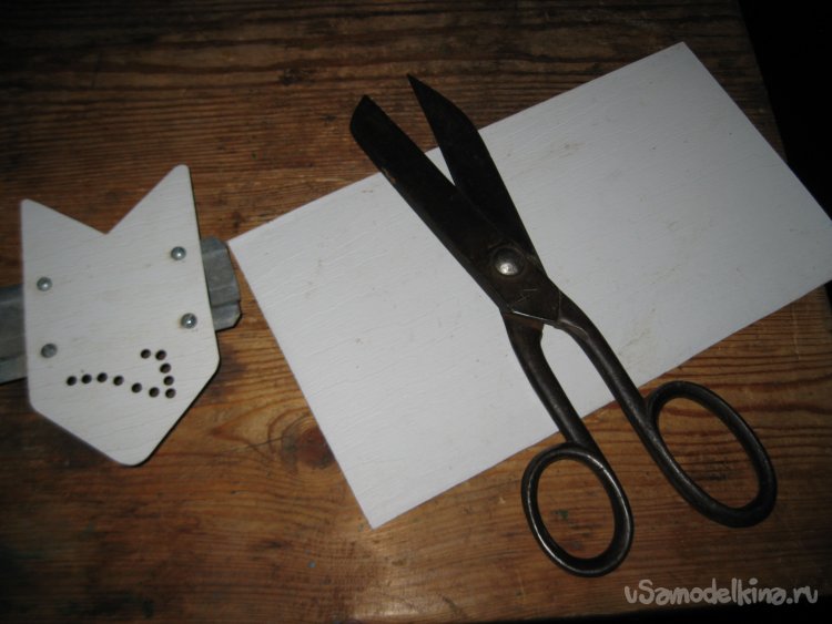 После этого, на одной из заготовок я начертил контуры стрелки указателя и наметил центры четырех отверстий под крепеж.