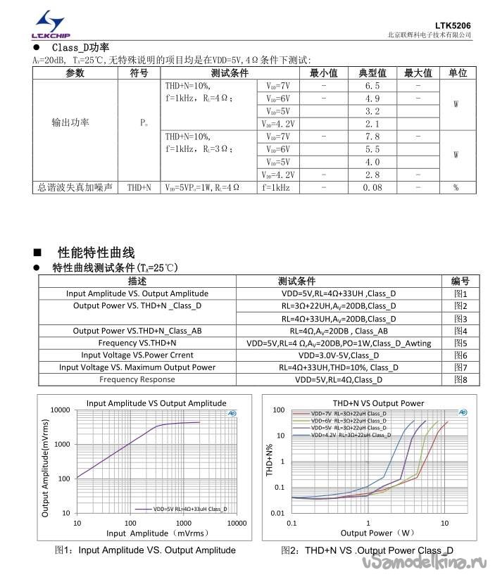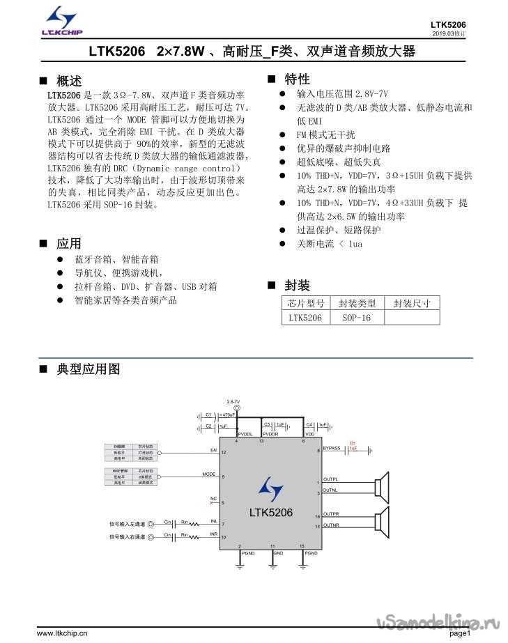 На первой странице можно узнать, что LTK5206 двухканальный аудиоусилитель с выходной мощностью 2х7,8 Вт.