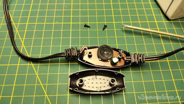 Выкручиваю саморезы и располовиниваю корпус. На плате виден сам переменный резистор регулировки громкости и электролитический конденсатор фильтрации питания.