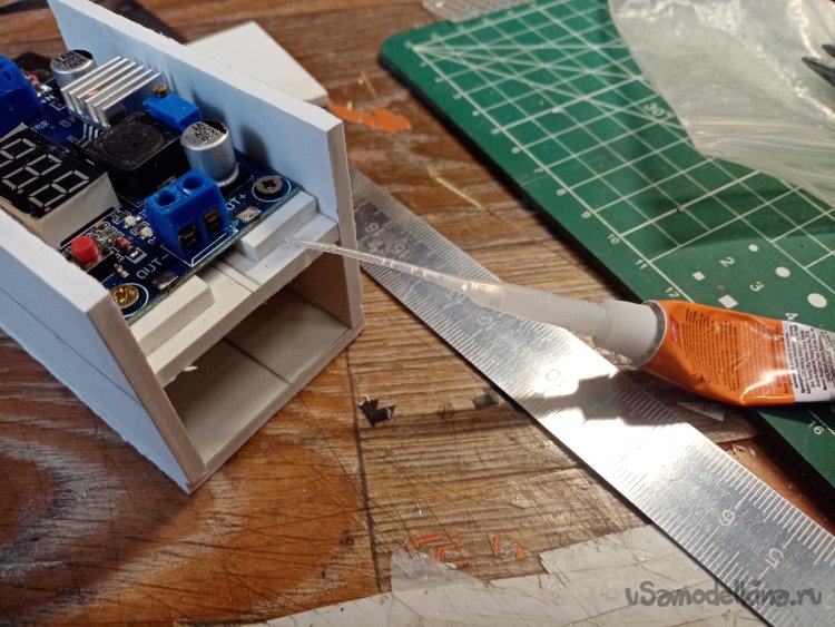 Затем установив аккумулятор на днище определяю положение средней полочки и приклеиваю её циакрином между вертикальными стенками.