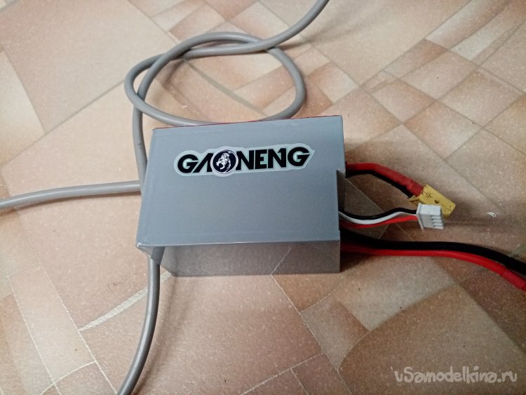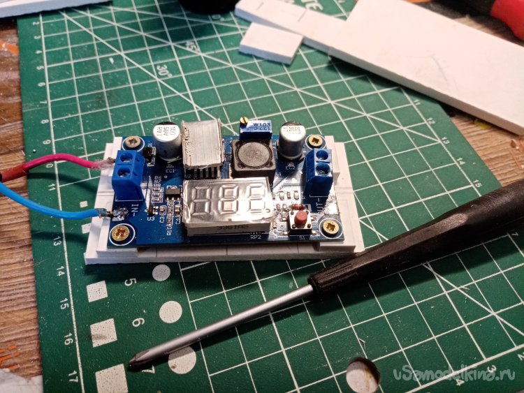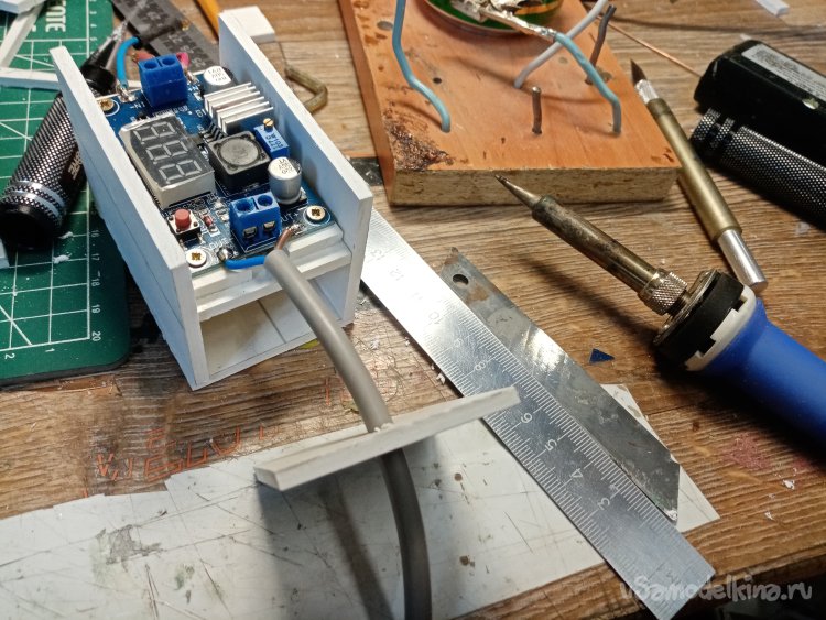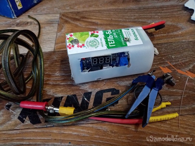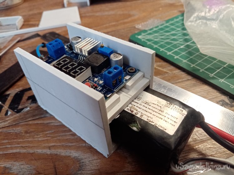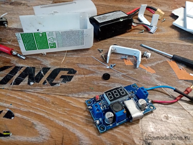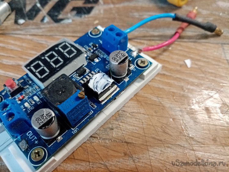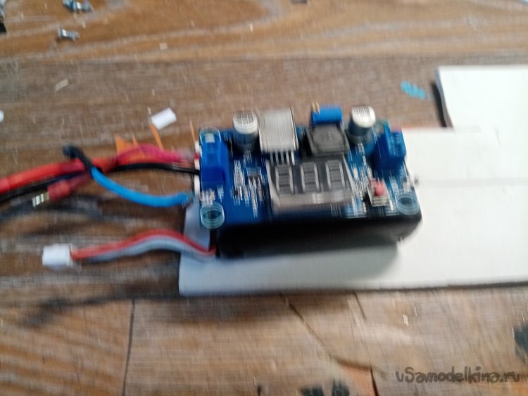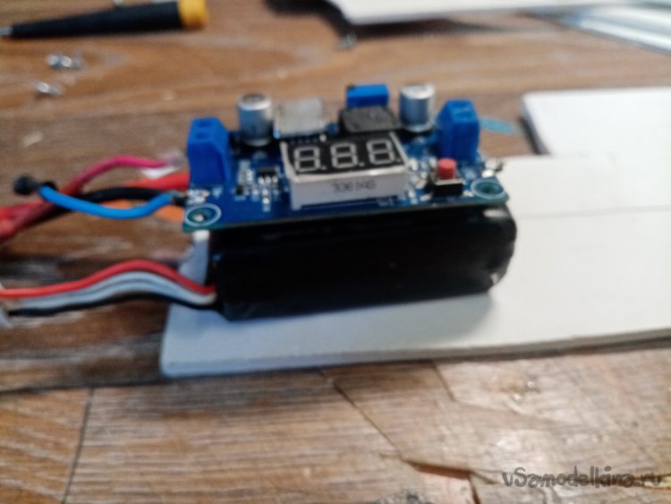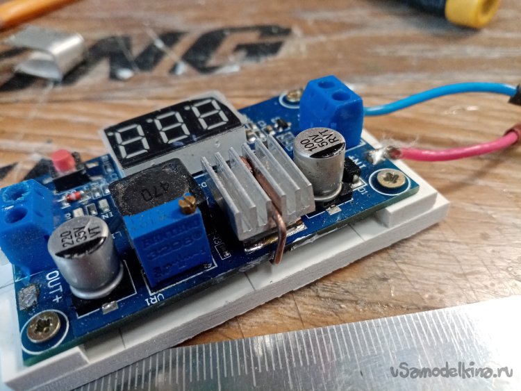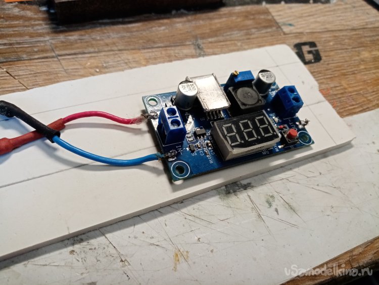 Порылись в интернете, и нашли нужную микросхему даже в нашем городе. Быстренько метнулись в магазин, и вот Вам пожалуйста. Входное напряжение в 12 вольт. Можно использовать стандартную литий-полимерный аккумулятор от моделей. Понижает напряжение до 1,5-6 вольт. Быстренько припаяли проводульки, попробовали в деле.