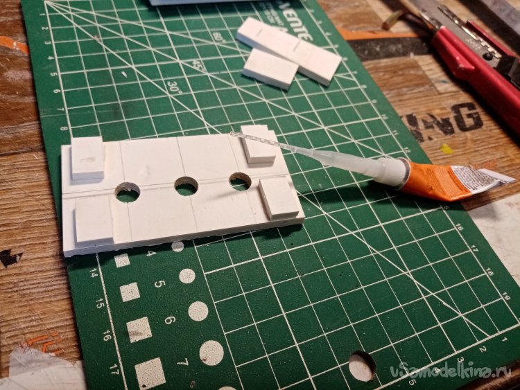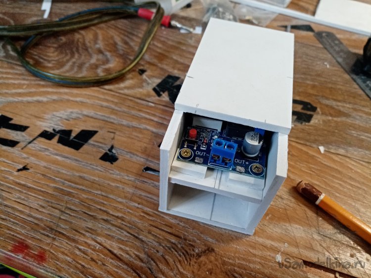Нужна неплохая вентиляция. Схему устанавливаю на небольшие подставки. Чтобы между нижней плоскостью и полочкой было некоторое расстояние. Вырезаю из пластика прямоугольники в районе крепежных отверстий. Затем приклеиваю все заготовки на циакрин.