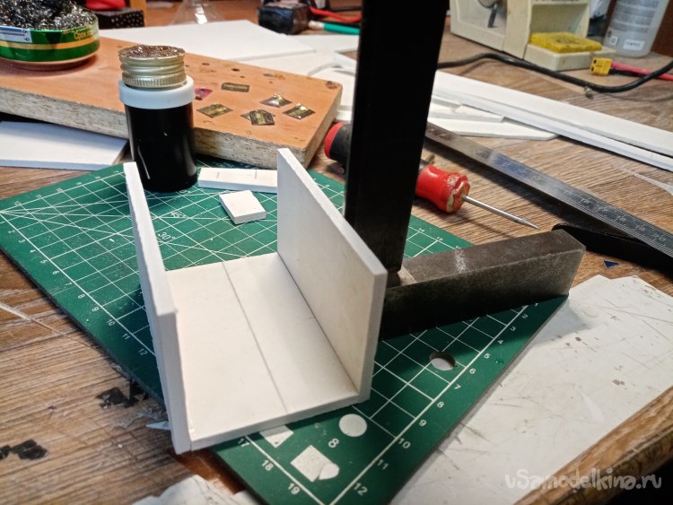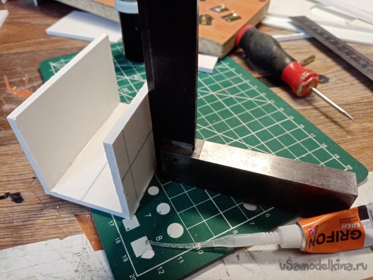 Можно начинать собирать коробочку. Боковые стенки приклеиваю с помощью циакрина. Вертикальность контролирую угольником. Вот досада. Приклеил стенки с наружной стороны днища. А проектировал на основании. Быстренько отламываю заготовки и переклеиваю. Опять контролирую вертикальность. Да и все резки выполняю на специальном коврике для резки. Многослойном.