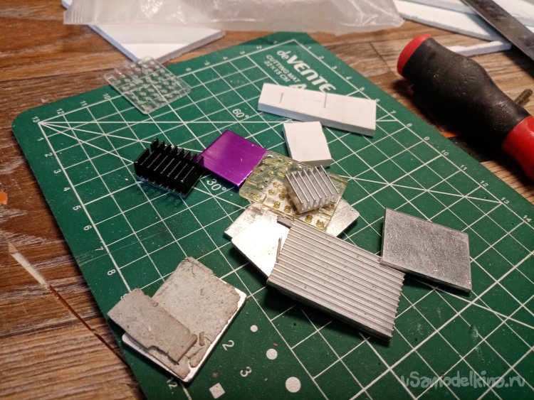 В предыдущей версии сборки охлаждение осуществляли при помощи кусочка алюминия. Такой вариант, конечно, не подходит в моей модернизированной и улучшенной конструкции. Извлекаю несколько радиаторов. Подбираю нужный размер. На охлаждаемый элемент наношу термопасту.