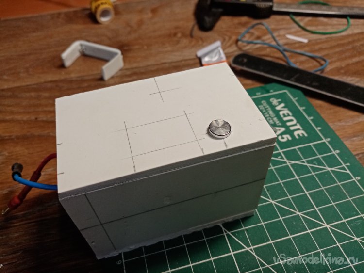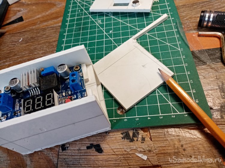 В верхней крышке нужно организовать несколько отверстий. Для кнопочки переключения режимов, окошка дисплея и небольшого отверстие под регулировку выходного напряжения. Начинаю размечать места вырезов. Система достаточно проста, сдвигаю крышку и размечаю положение элементов в двух пересекающихся векторах.