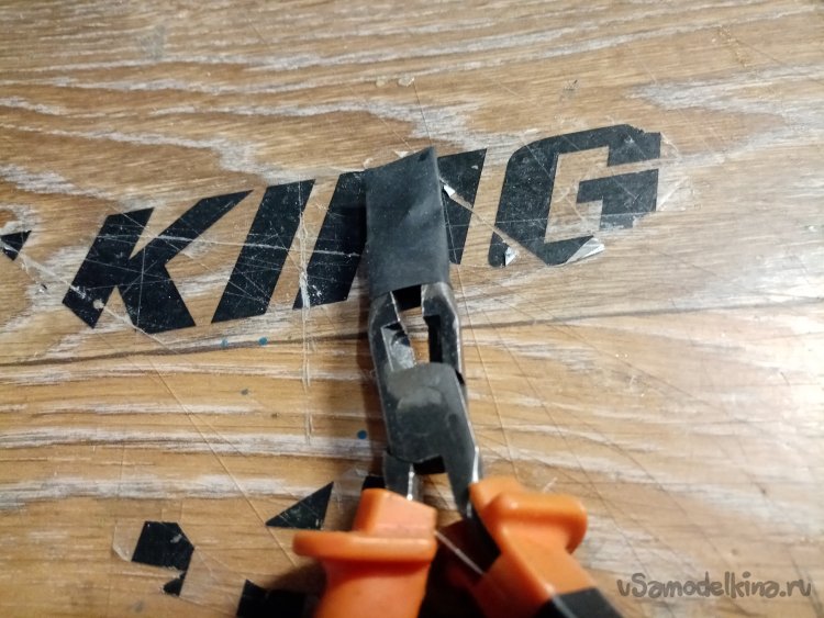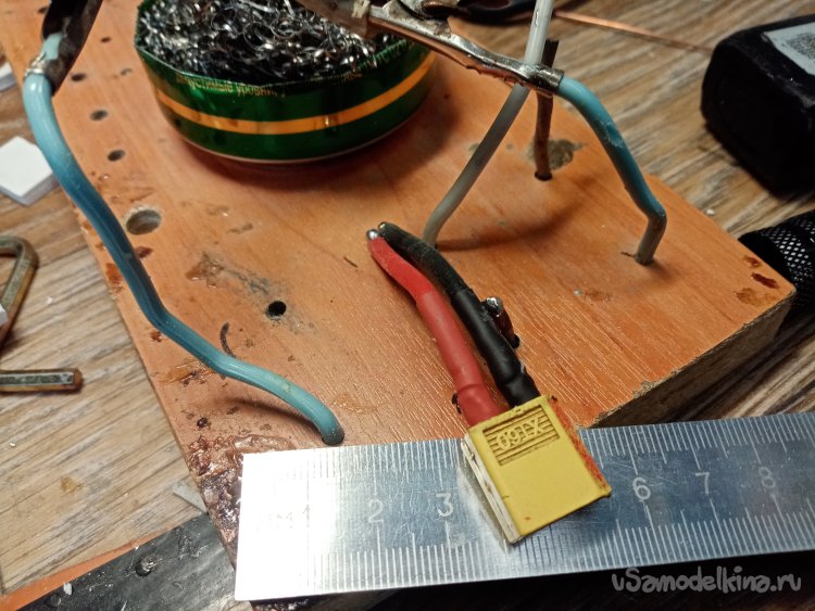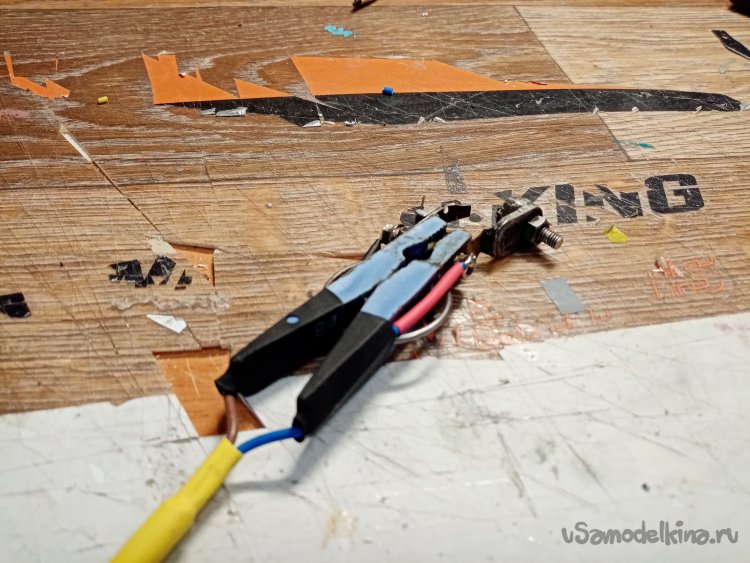 Контакты на свечу двигателя изготовил из пластиковой прицепки. Нужно зафиксировать припаянные провода на конструкции. Выбираю для этой цели термоусадку. Но досада. Она н микрон меньше нужного размера. Не беда, растягиваю трубочку именно на этот микрон.