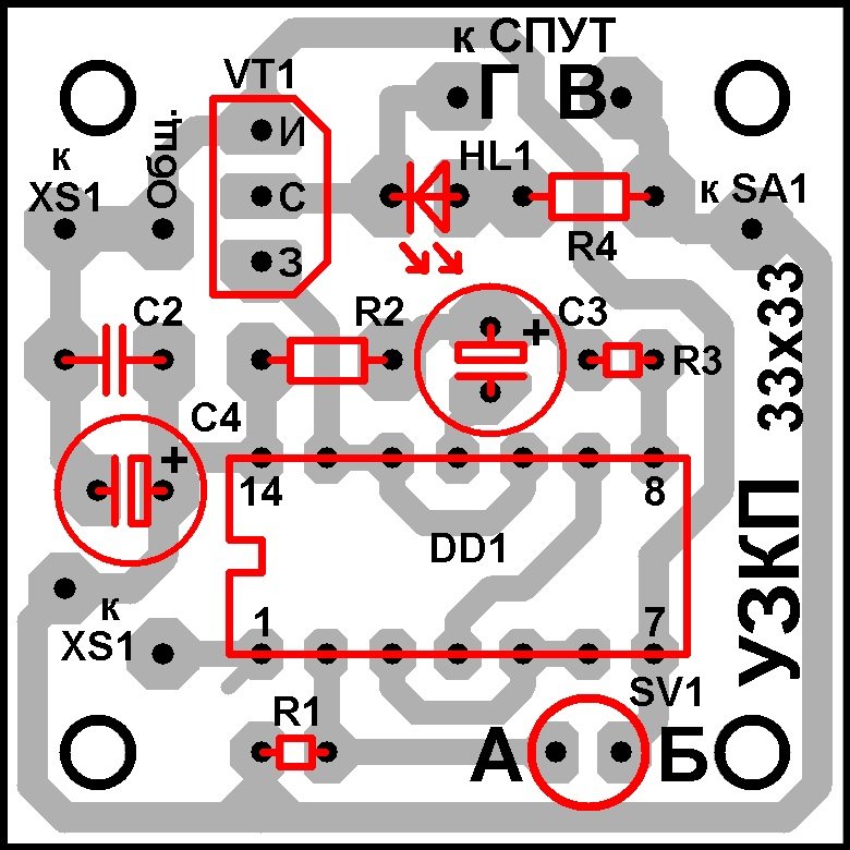 1). Если срабатывание УЗКП от физических (вибрационных воздействий) не нужно, то (не выпаивая из платы тонковыводный датчик SV1) медную дорожку на ПП, ведущую от правого вывода R1 к точке А датчика SV1, следует разорвать (перерезать скальпелем).