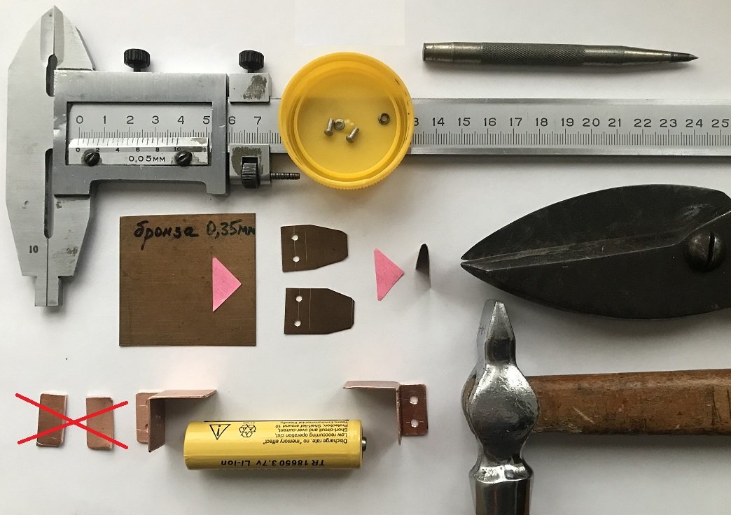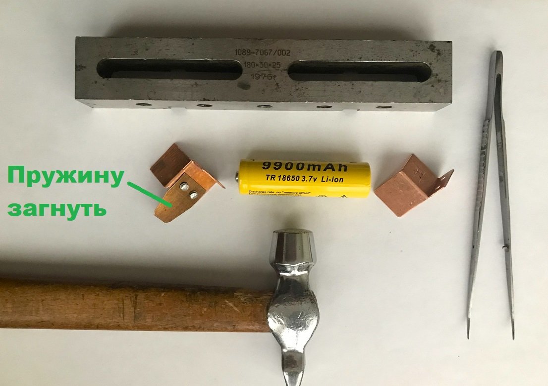 4). Самодельный держатель аккумулятора получился надёжным за счёт вклёпанной в контакт «минус» бронзовой пружинящей пластины.