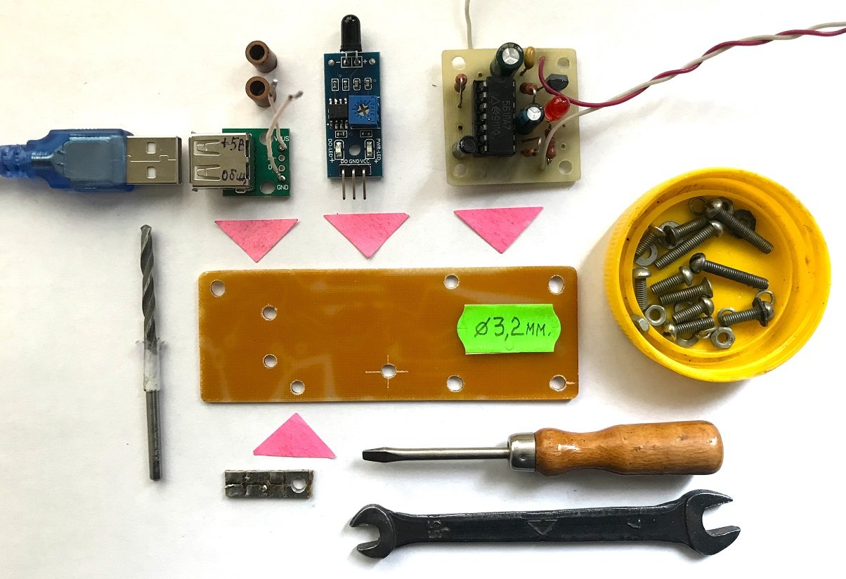 Паяльник, дрель, свёрла 2,1; 3,2; 4,2 мм, ножницы по металлу, штангенциркуль, тиски слесарные или гибочное приспособление, отвёртка, ключ рожковый и торцевой, 2 пассатижей, нож канцелярский.