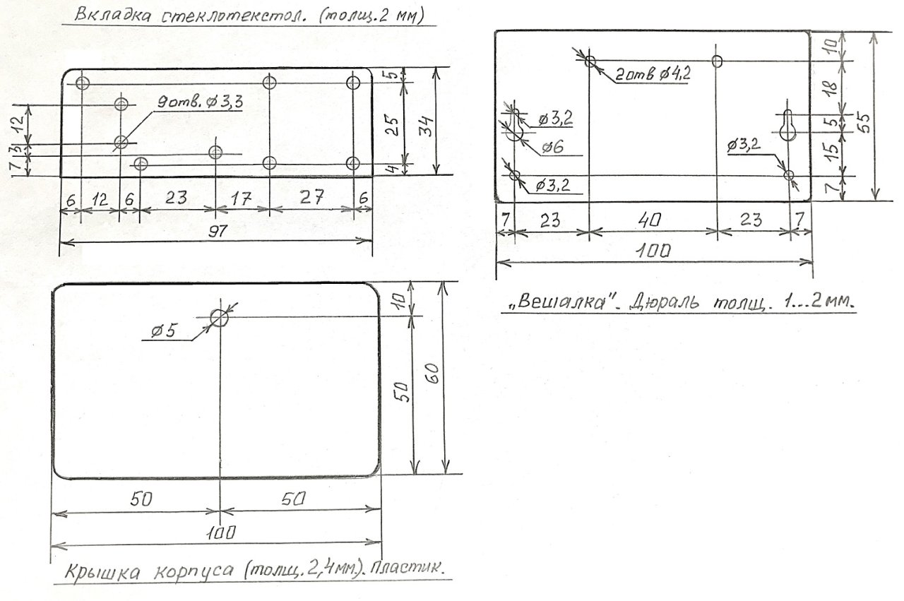 Эскизы: 1) общего крепёжного основания («вкладки стеклотекстолитовой»); 2) «вешалки» с ушками, которая также соединяет УЗКП со СПУТ; 3) Готовая крышка корпуса с отверстием под фотодатчик BL1 (длина волны 940 нм).