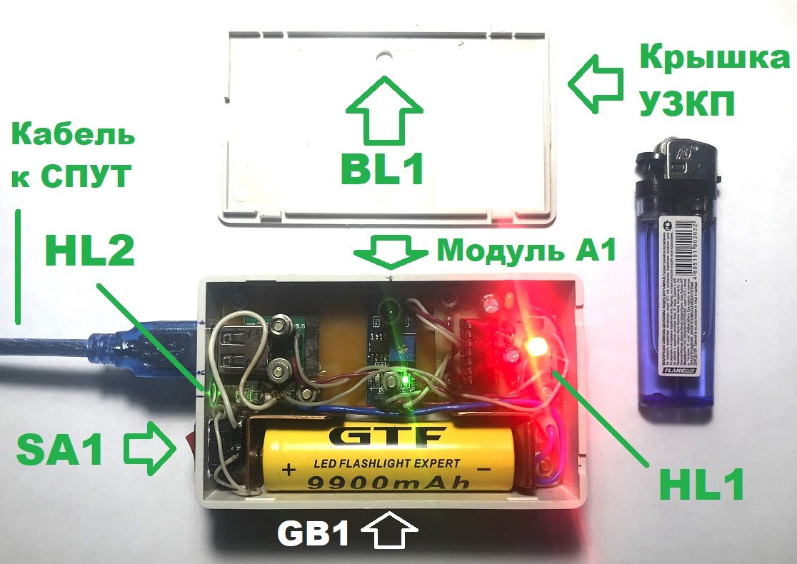 На рисунке 11 светится зелёный LED модуля А1, индицирующий включение питания и красный LED HL1, индицирующий подачу питания на СПУТ.