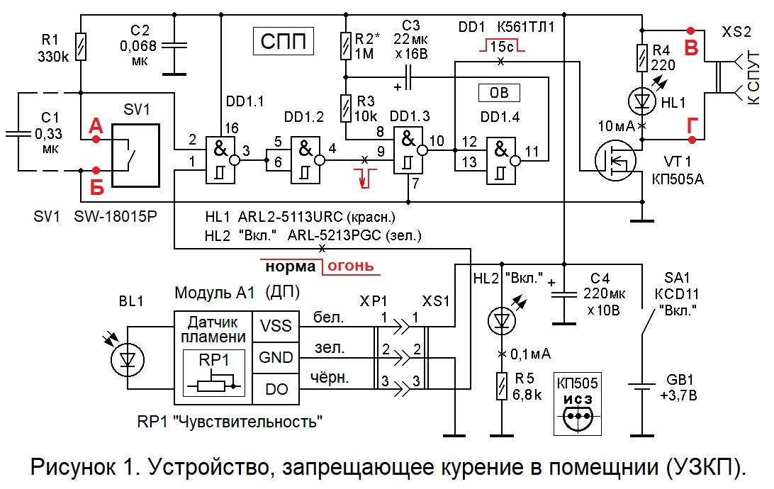 2). Если срабатывание УЗКП не нужно при появлении открытого огня, то вход (вывод 1) элемента DD1.1 отключают от контакта 3 разъёма XS1 и подключают к выводу 14 элемента DD1.1.