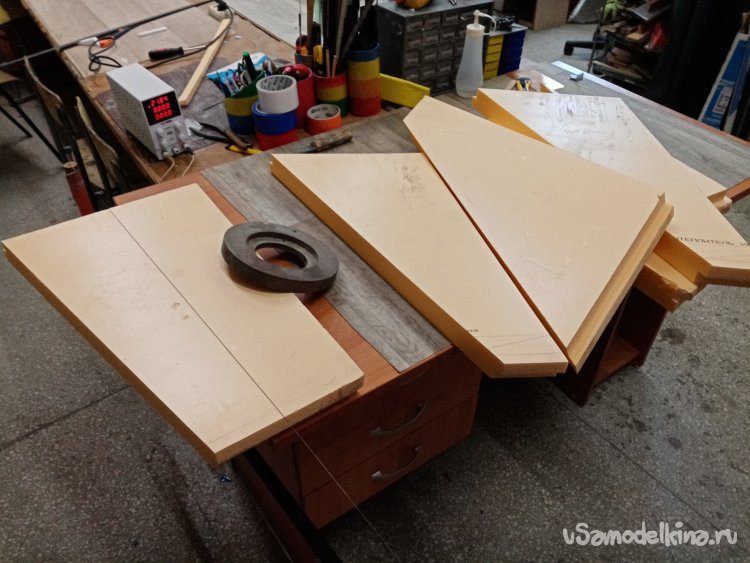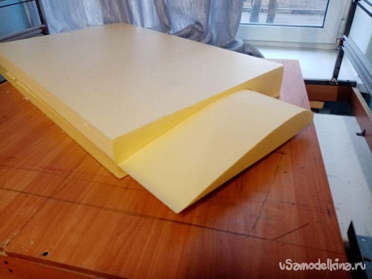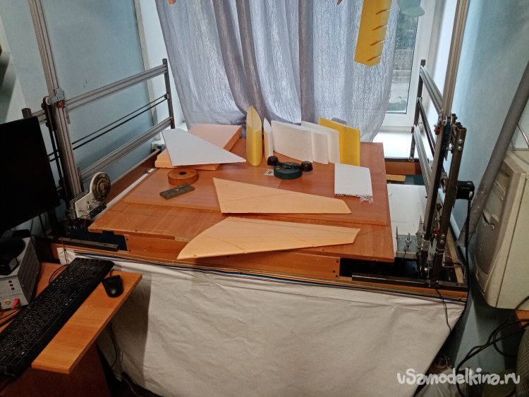 В качестве основного материала при изготовлении фюзеляжа буду использовать нарезку пластин из отходов резки крыльев большого проекта. Нарезал на горизонтальном станке и нихромовой проволокой.