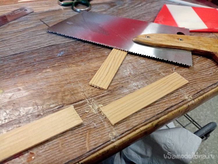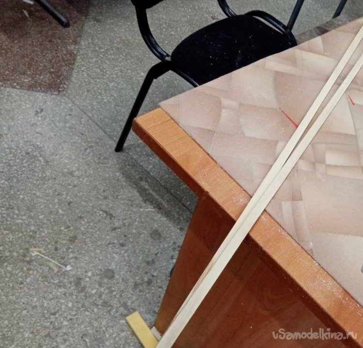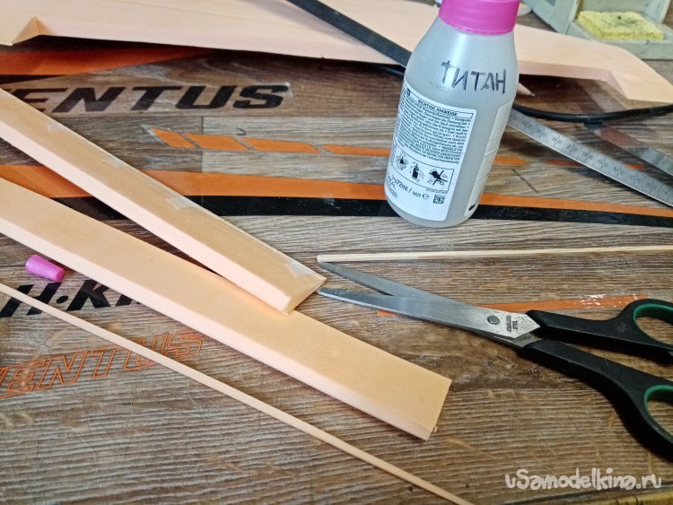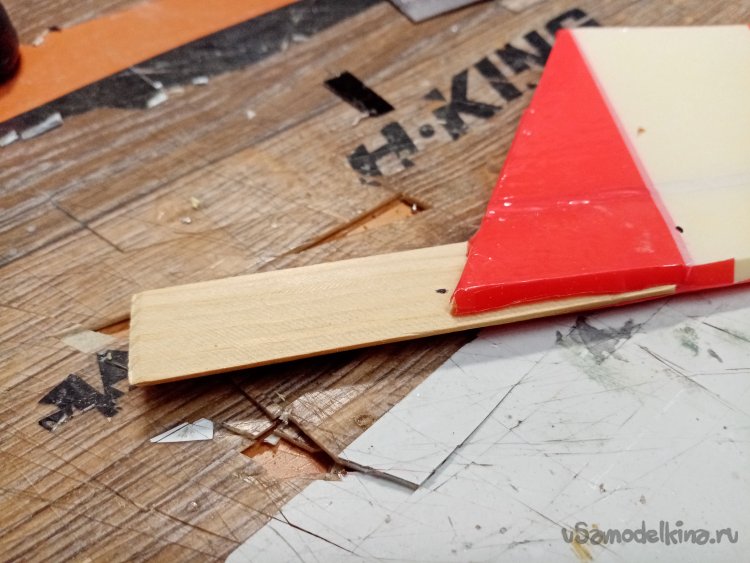 Руль высоты состоит из двух частей. Также все крою по размерам оригинала. В качестве соединения парочки подвижных частей руля использую пластинку из дерева. Предварительно разрезав заготовку, вклеиваю усиление.