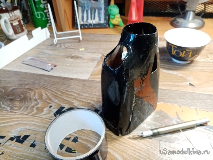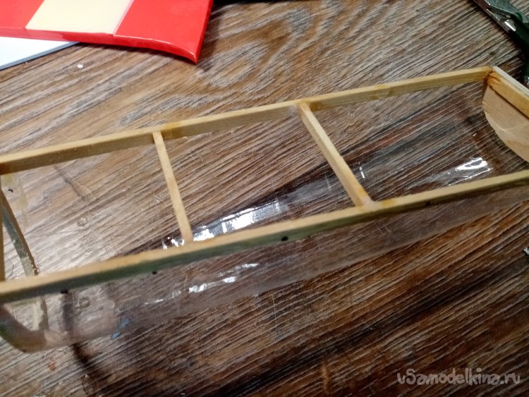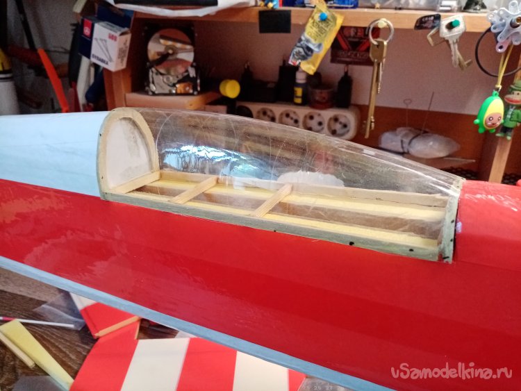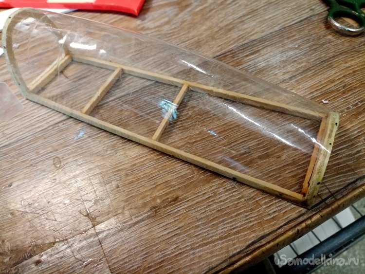 Фюзеляж готов и даже оклеен цветным скотчем. На деревянном шаблоне осаживаю из бутылки фонарь кабины. Из палочек реечек собираю раму и приклеиваю фонарь на место.