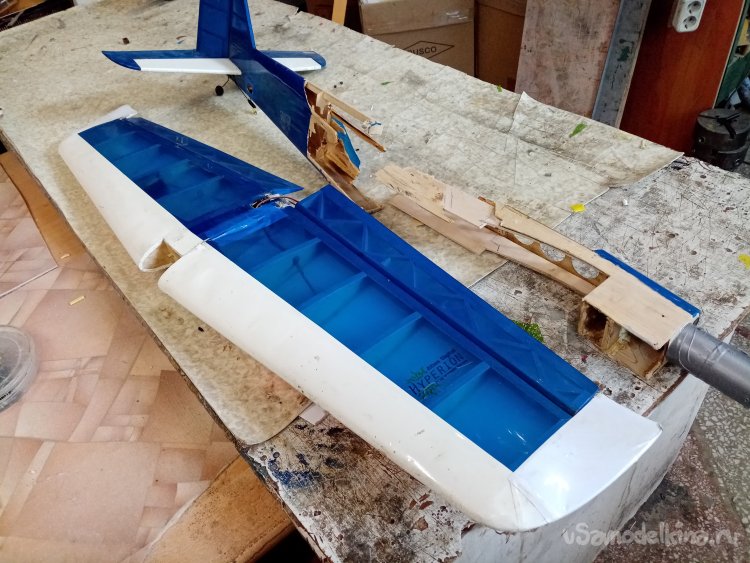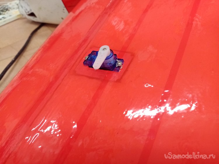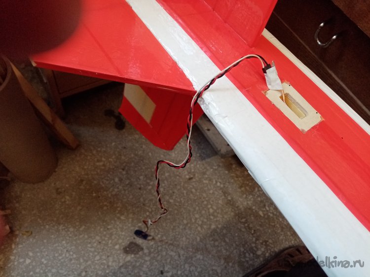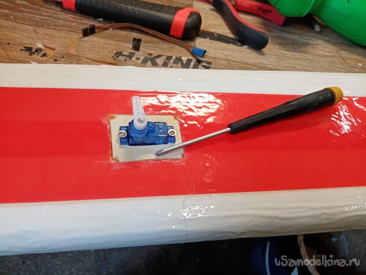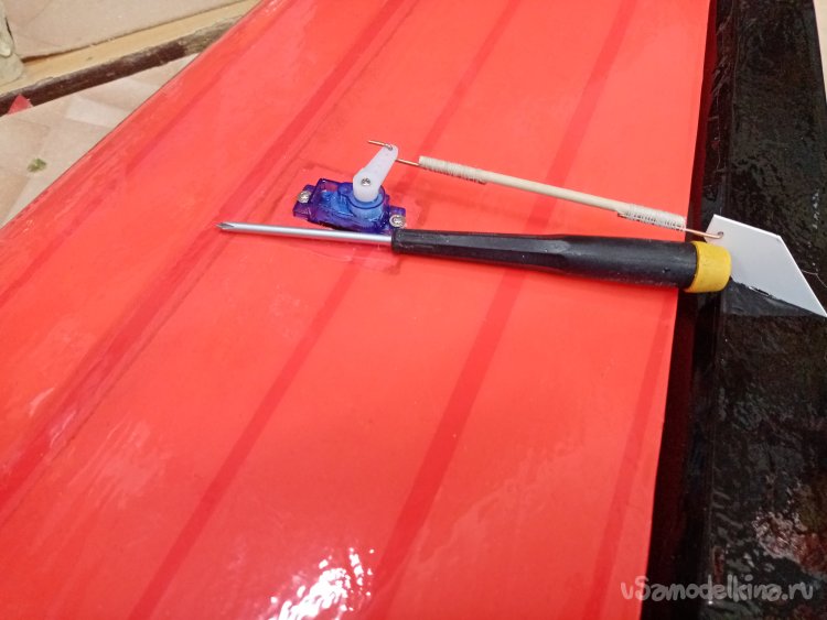 Затем протаскиваю крыло через фюзеляж и устанавливаю на второй консоли сервопривод и навешиваю элерон