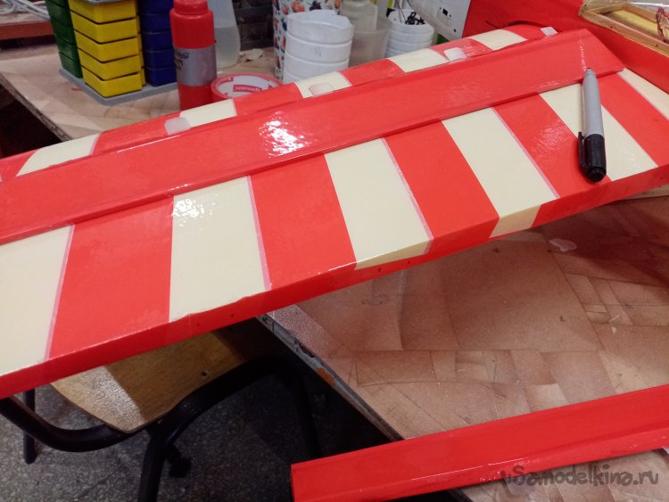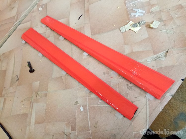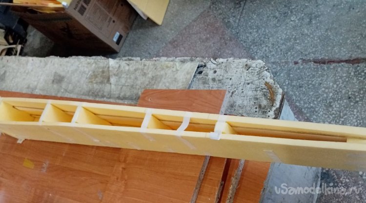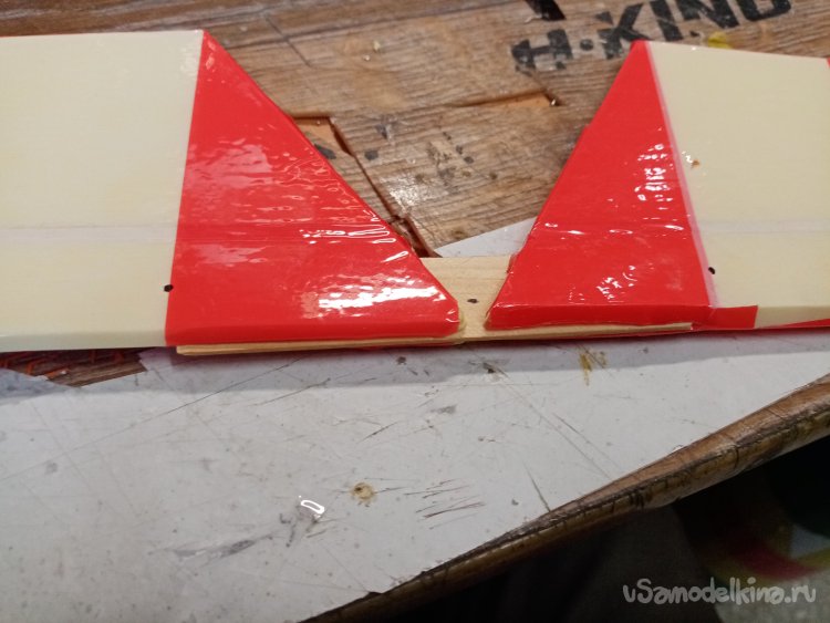 Напилил реек усиления на крылья. Отрезаю элероны, на тонкий конец которых наклеиваю рейки усиления на титане и фиксирую малярным скотчем.