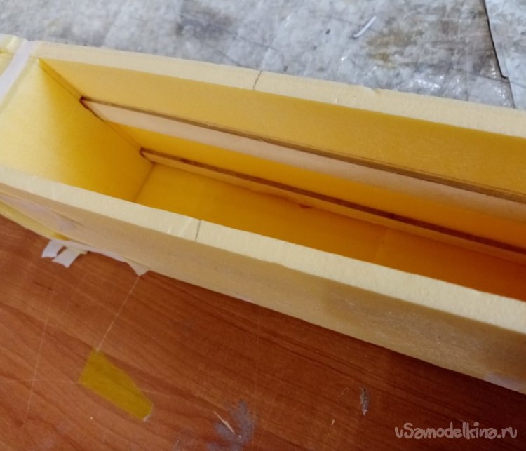 Приклеиваю рейки к бортам фюзеляжа при помощи термопистолета. И собираю конструкцию в кучу. В гаргрот и пузико фюзеляжа будут иметь полукруглую форму как на разбитом оригинале. Пока приклеиваю утеплитель с запасом. После застывания клея обрежу верх и низ по контурному шаблону.
