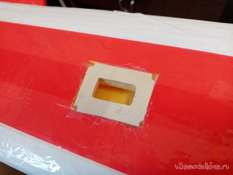 В хвостовой части нужно установить рамки для сервоприводов. Выпиливаю лобзиком из остатков 4 мм шлифованной фанеры. Затем терморезаком вырезаю карманы для вклейки рамки заподлицо с бортом. Вклеиваю рамки в хвостовой части для сервоприводов на руль высоты и руль направления.
