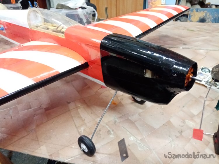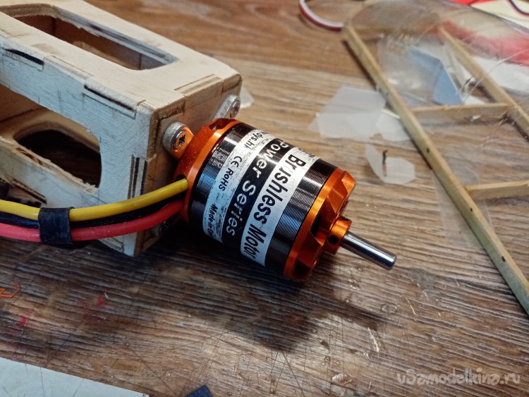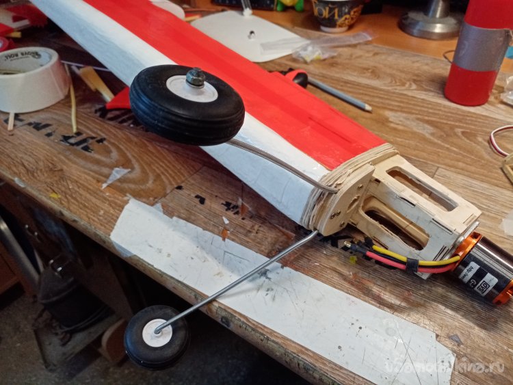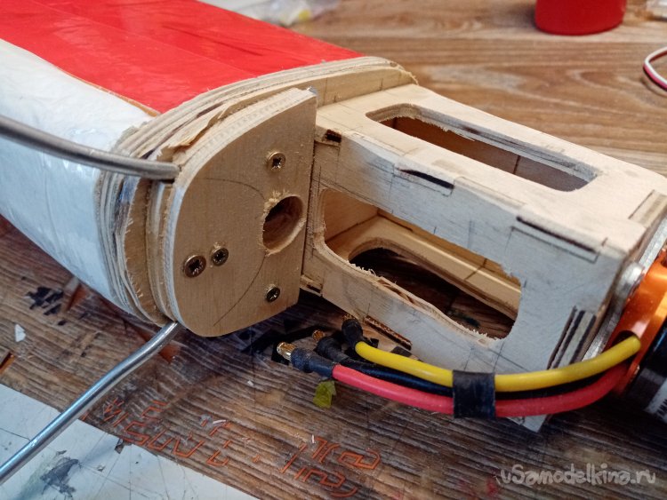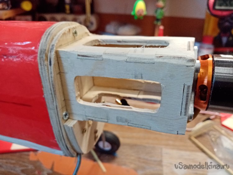 Немного переделаю носовую часть с целью усиления. Но капот буду использовать стары. Промеряю, вынос моторамы в капоте, выпиливаю из фанеры. Заодно на мотораме оформил крепление стоек шасси. Которые изготовил из проволоки от дужек пластиковых ведер. Всю конструкцию склеил ПВА. Крепежную пластину шасси прикручиваю на болтики к мотораме. Мотор поставил достаточно мощный.
