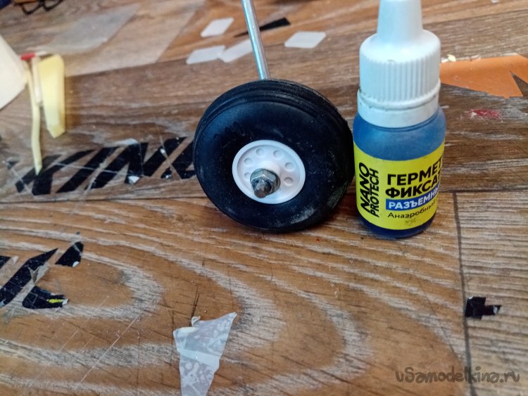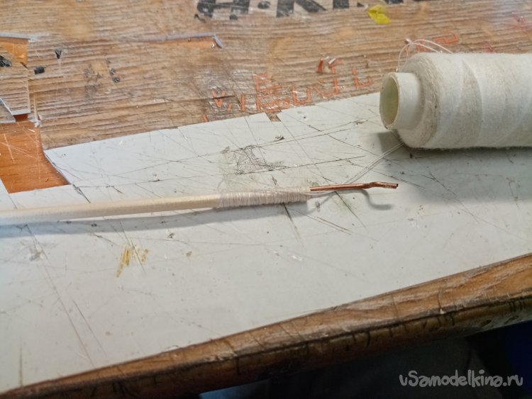 После изготовления одного из наконечника тяги, нужно отрегулировать длину тяги. Закрепляю один конец на качалке сервопривода, отрезаю нужную длину. Отрезаю по размеру. Затем готовлю следующую оконечность из проволоки и приматываю нитками, фиксирую циакрином. Тяги готовы.