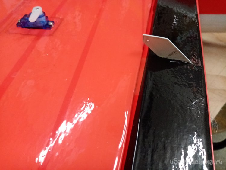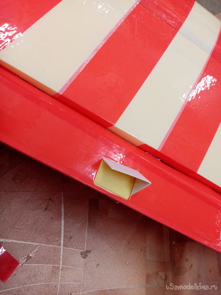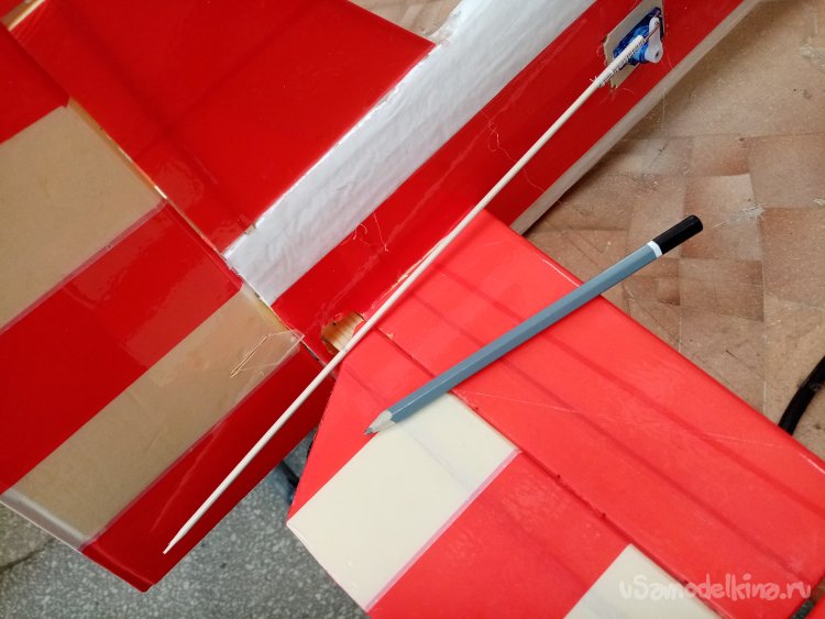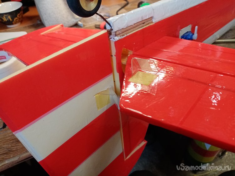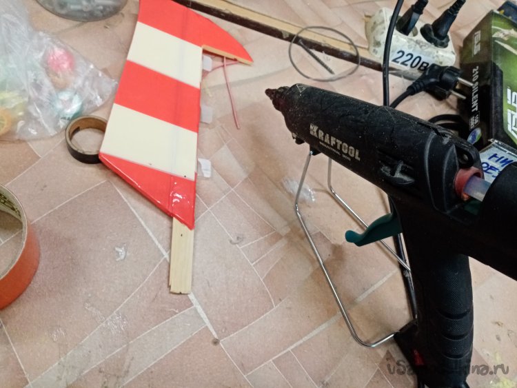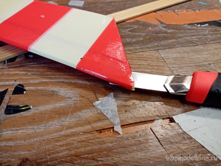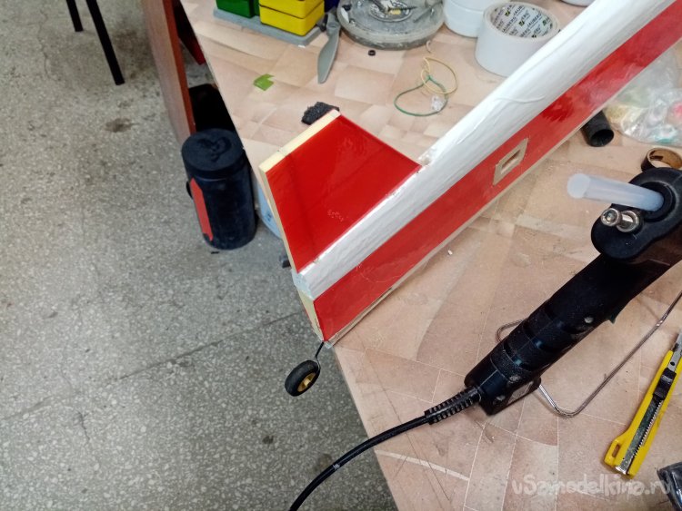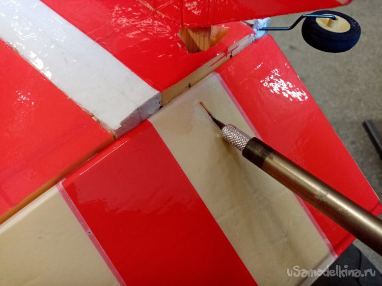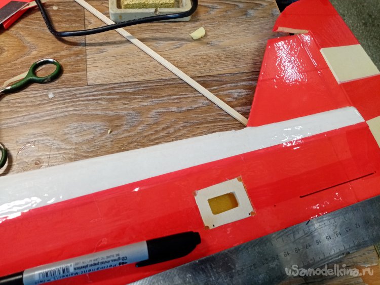С обратной стороны руля высоты осторожно вырезаю квадратик в скотче. Нужно приклеить пластик к пенопласту, поскольку к скотчу все приклеивается очень плохо. Закрепляю кабанчик термопистолетом.