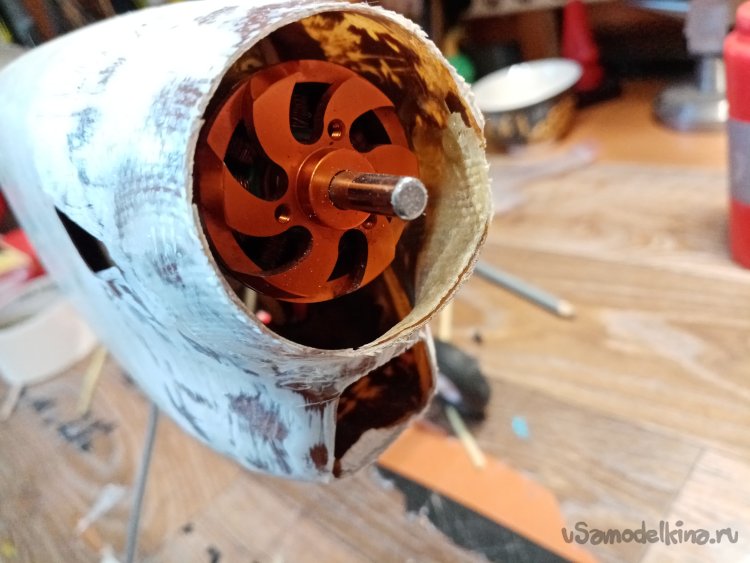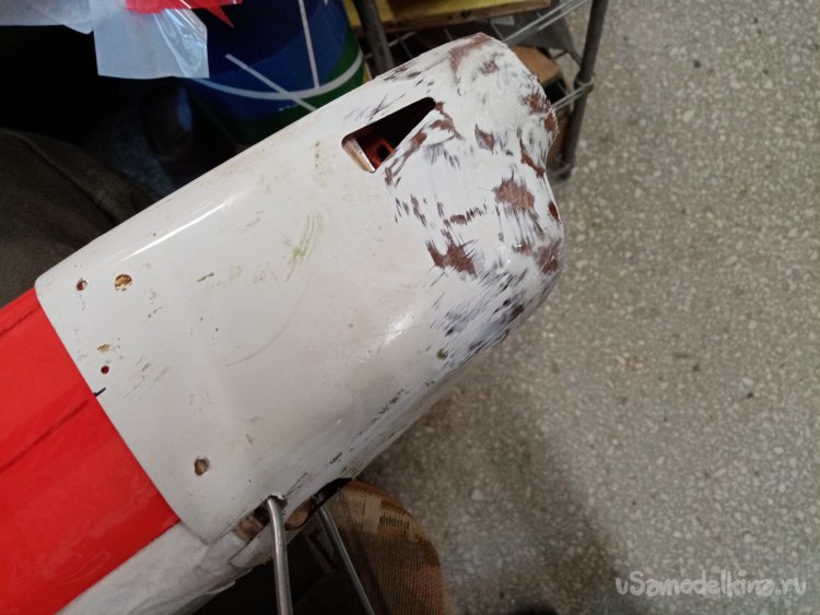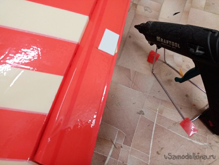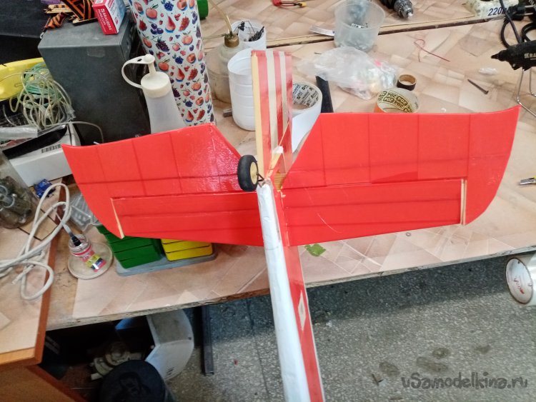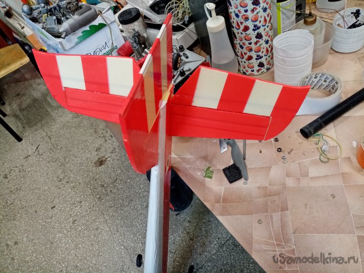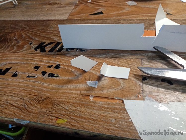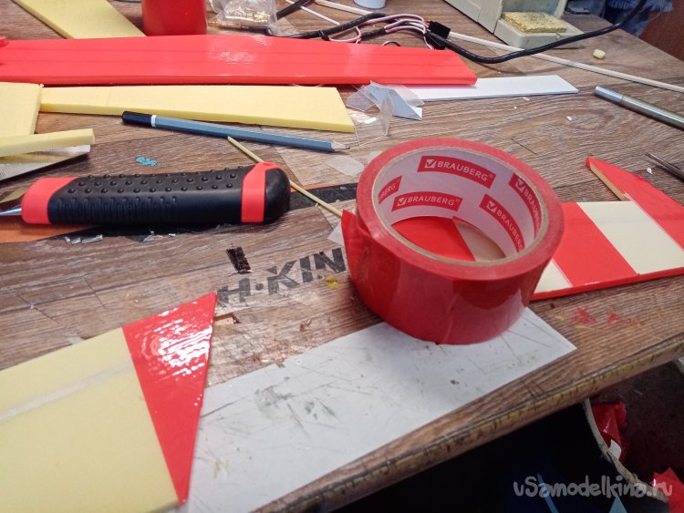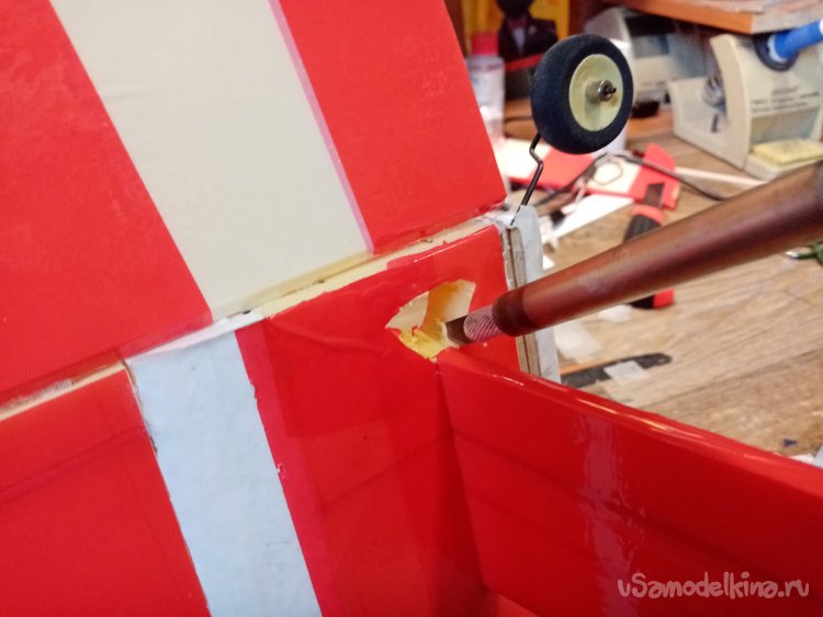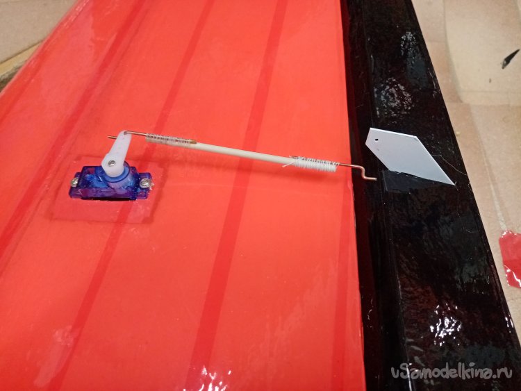 С обратной стороны руля высоты осторожно вырезаю квадратик в скотче. Нужно приклеить пластик к пенопласту, поскольку к скотчу все приклеивается очень плохо. Закрепляю кабанчик термопистолетом.