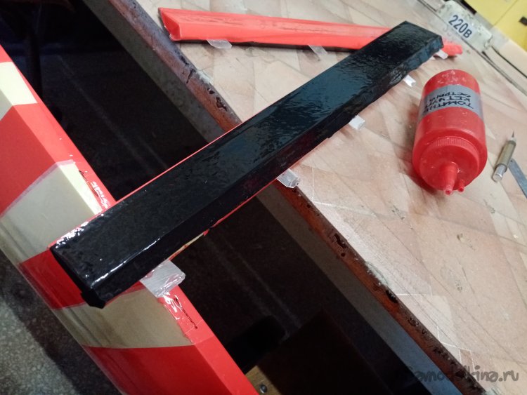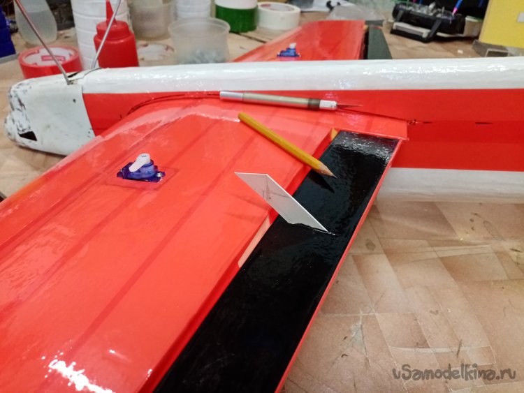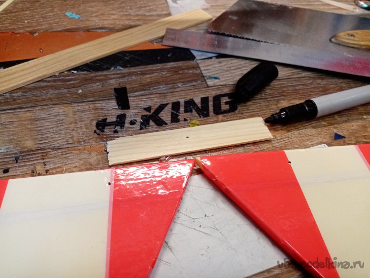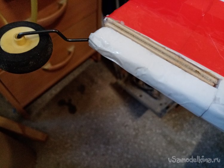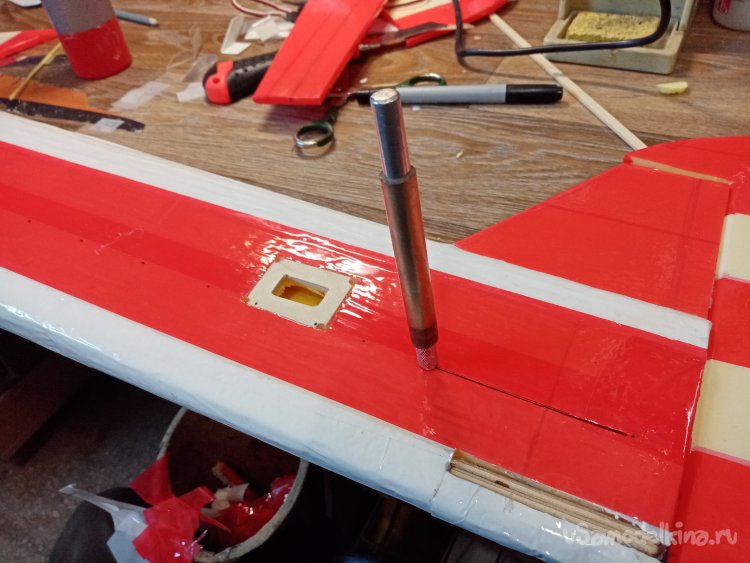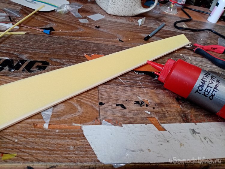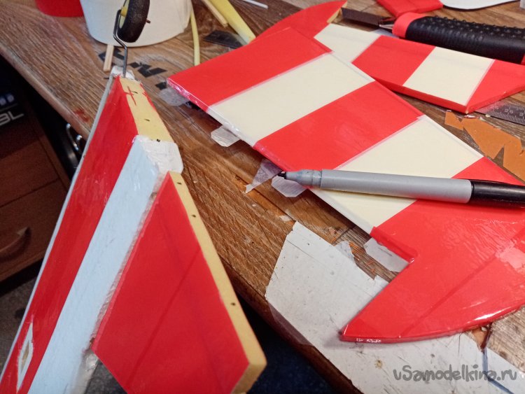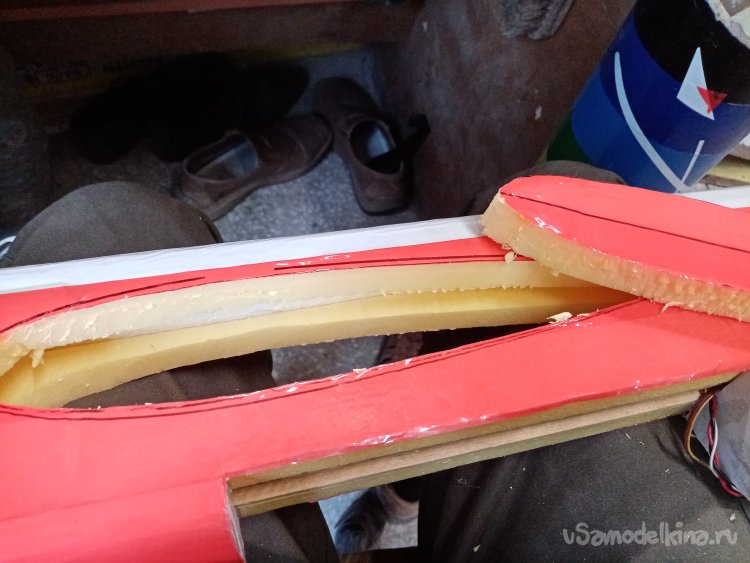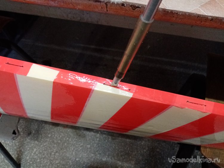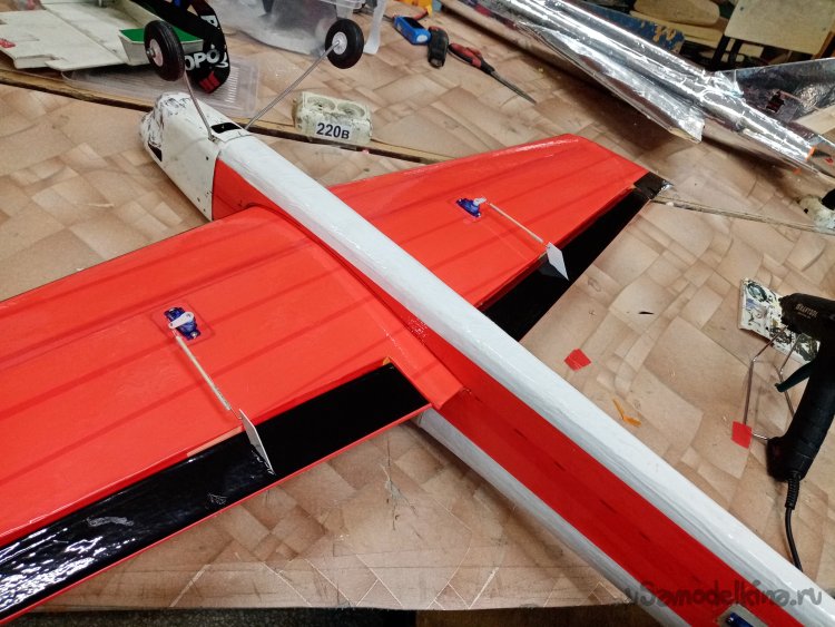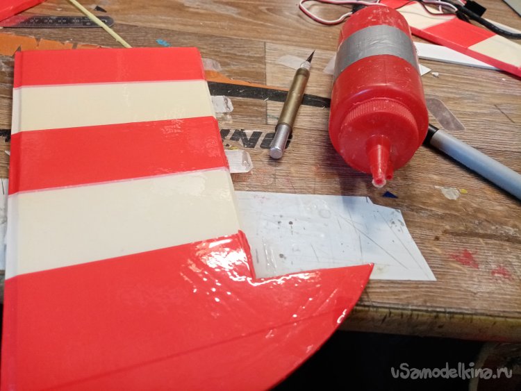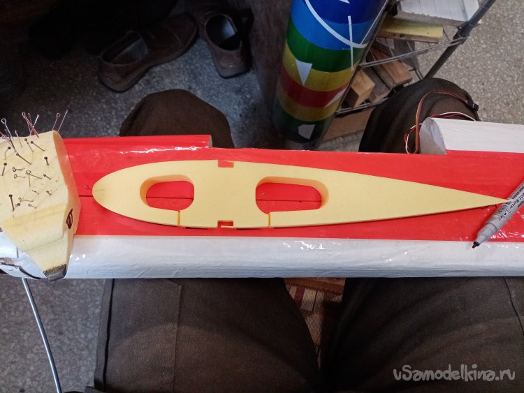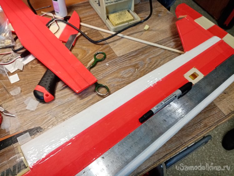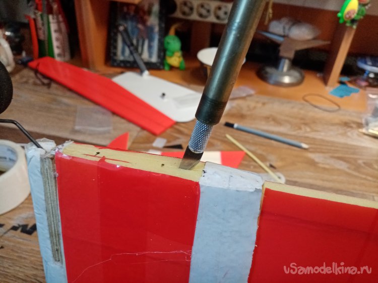 Врезаю кабанчик в элерон, размечаю длину. Подрезаю в размер. С обратной стороны элерона вырезаю место для вклейки кабанчика. Вклеиваю на термопистолет.