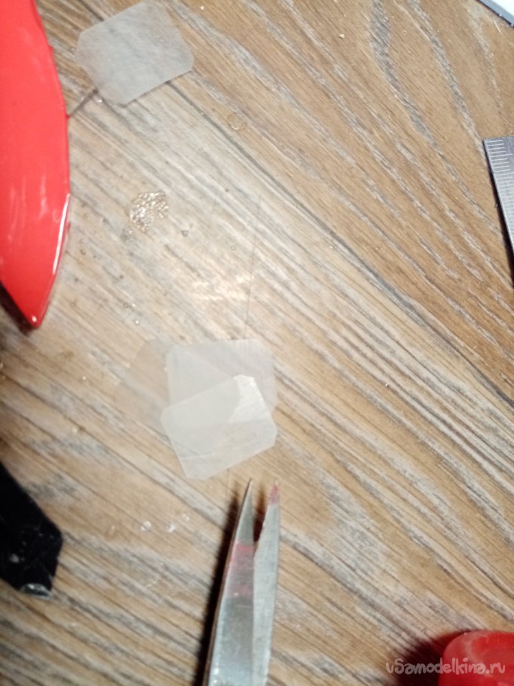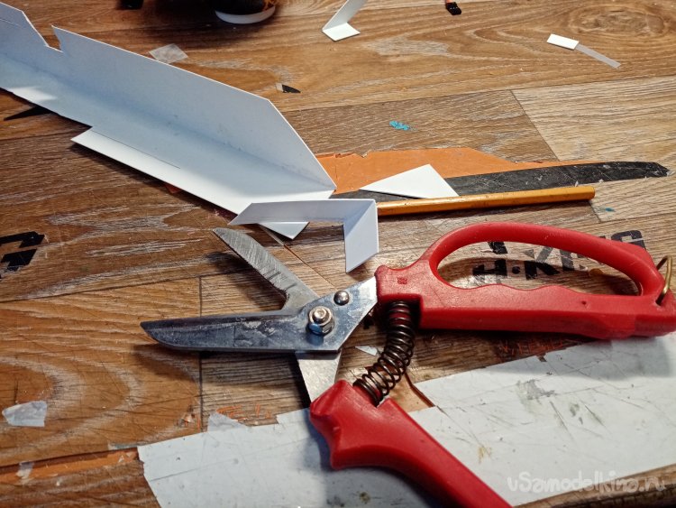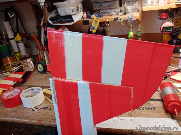 Вырезаю руль направления сверяясь по размерам с оригиналом. Оклеиваю цветным скотчем. Из пленки вырезаю петли и навешиваю руль направления на титан.