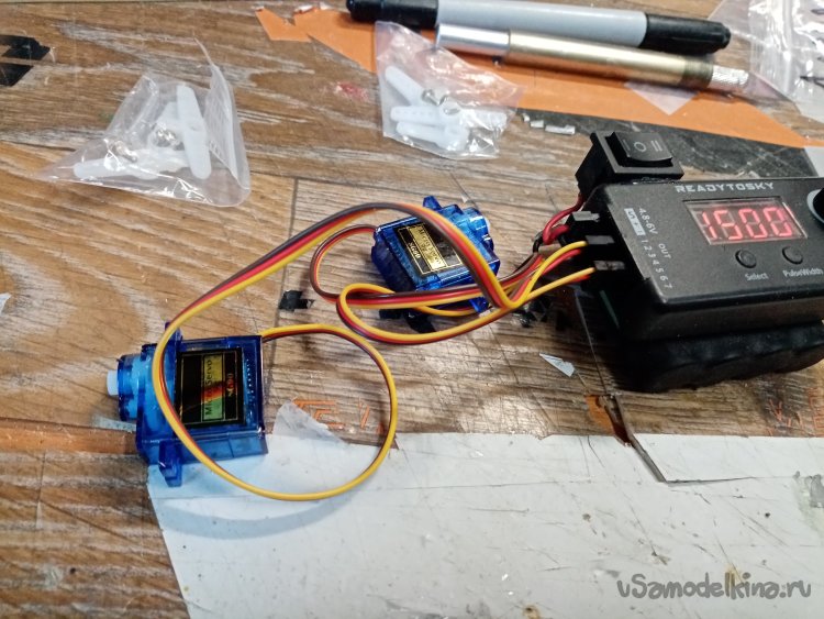 Нужно установить сервоприводы. Проверяю их обязательно перед установкой при помощи сервотестера. Но провода управления не дотягиваются до кабины, где будет установлен приемник. Приходится удлинять их при помощи удлинителей. Места соединения фиксирую при помощи малярного скотча. Затем по фюзеляжу просовываю кусок проволоки. Удачно попал прямо в вырез площадки. Приклеиваю к проволоке кончик провода и протягиваю обратно. Управление установлено. Затем фиксирую сервопривод на рамке при помощи болтиков.