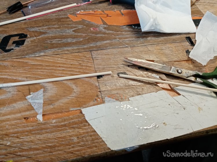 Следующий этап, нужно изготовить тяги управления от сервоприводов, до кабанчиков. Для этой детали применяю бамбуковую шпажку и парочкой наконечников из проволоки для сварочных аппаратов диаметром в 1.2 мм.