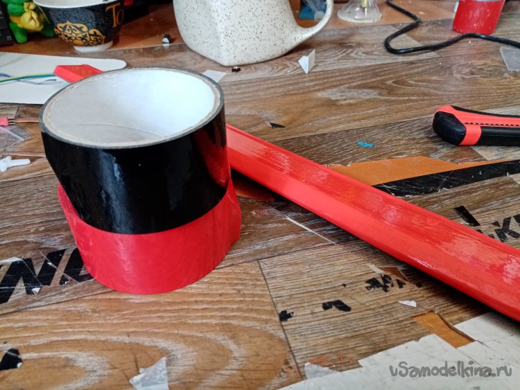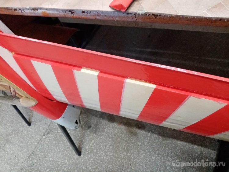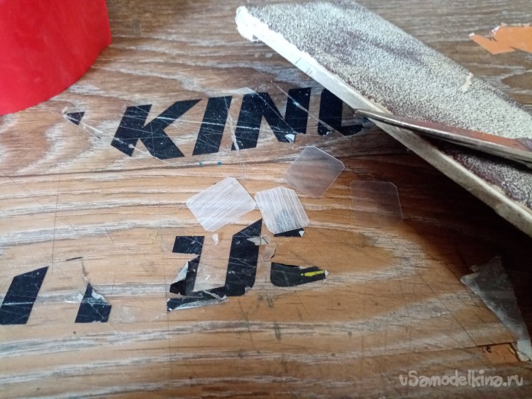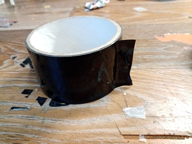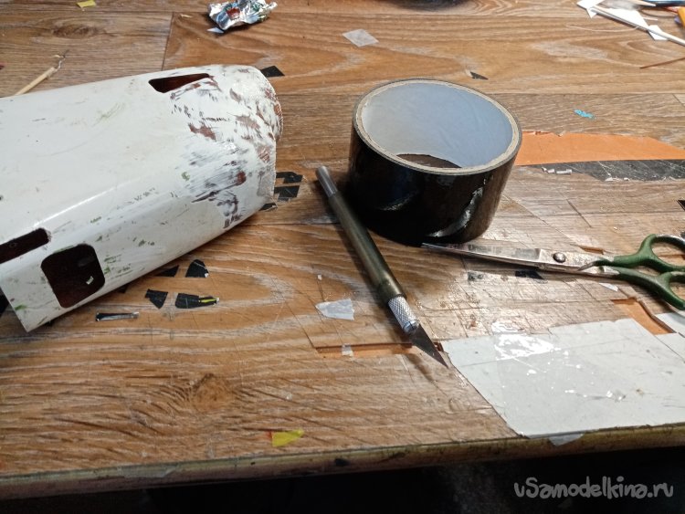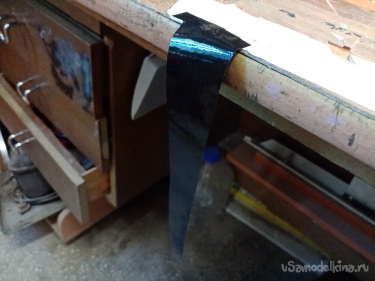 Отремонтированный капот оклеиваю черным скотчем. Для лучшего прилегания разрезаю рулон на полоски.