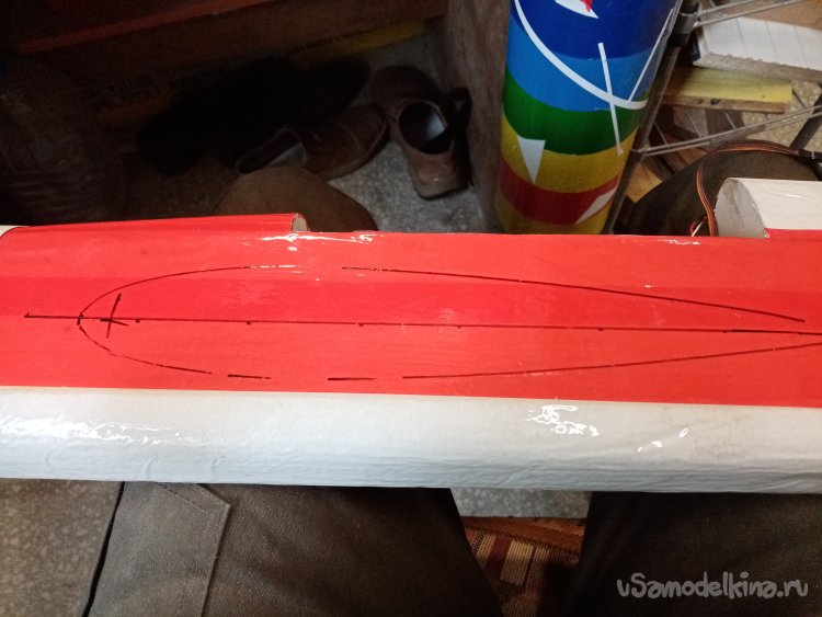Для установки крыльев в фюзеляж нужно вырезать отверстие нужного размера. Еще раз напрягаю станок и вырезаю шаблон крыла небольшой толщины. Отмеряю, установочные размеры крыла на оригинале и переношу на новый фюзеляж. Устанавливаю шаблон, обвожу фломастером. Затем прорезаю отверстие в детали насквозь.