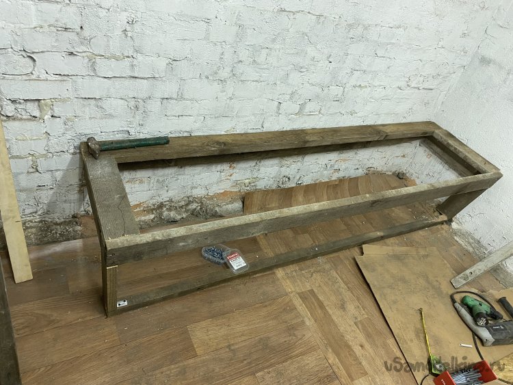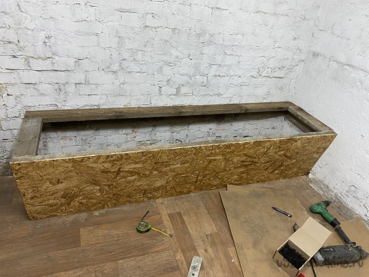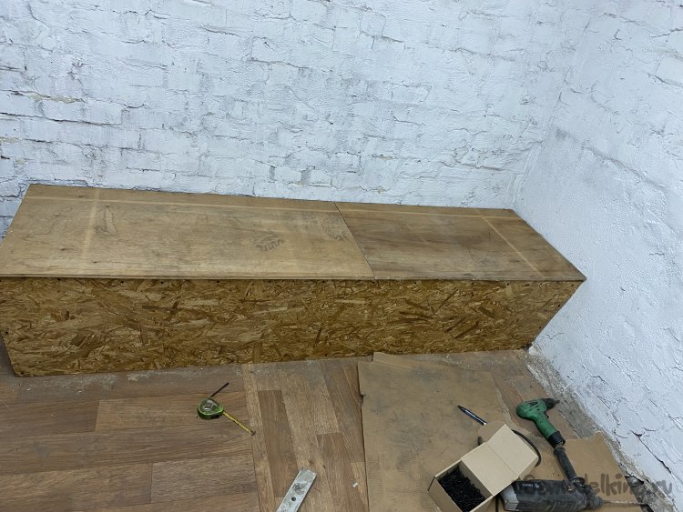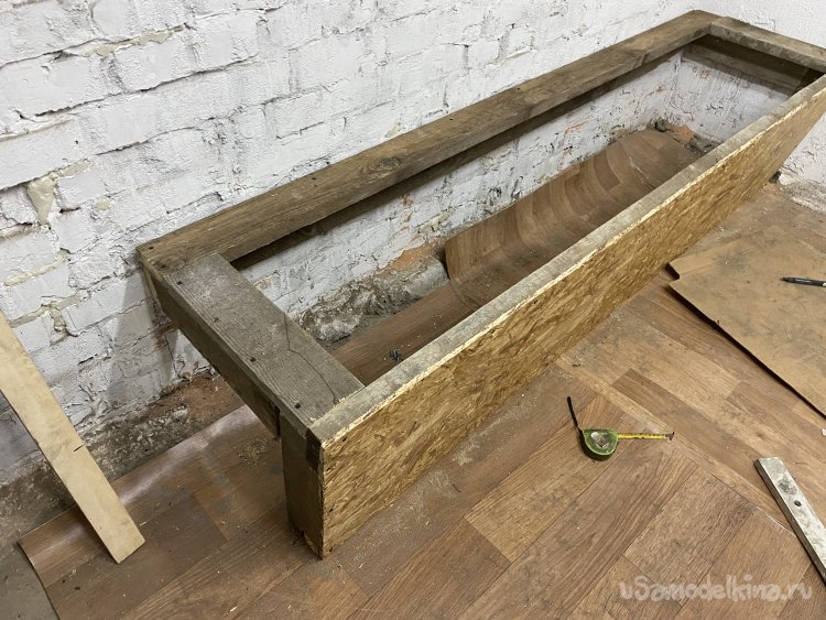 Каркас готов. Надо обшить чем-то. Для переднего края нашёлся большой обрезок листа ОСП, толщиной девять миллиметров: