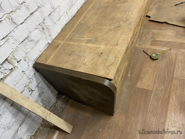 В последнее время она использовалась, как временная полка на стройке. (потому и вырезан кусок). Решил её и использовать. Подрезал по размеру, сохраняя в передней части заводской изгиб: