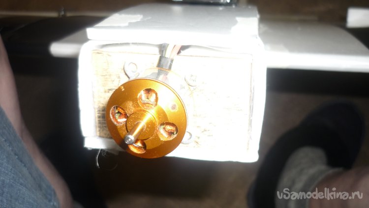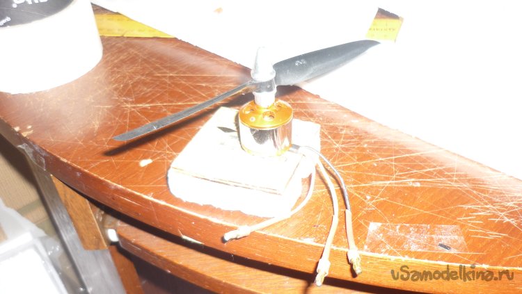 На фанеру прикрепил мотор с винтом. Мотор установлен под углом 1,5 градуса вниз и вправо.