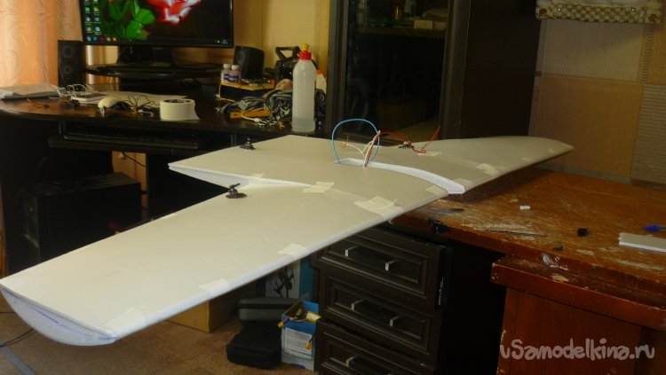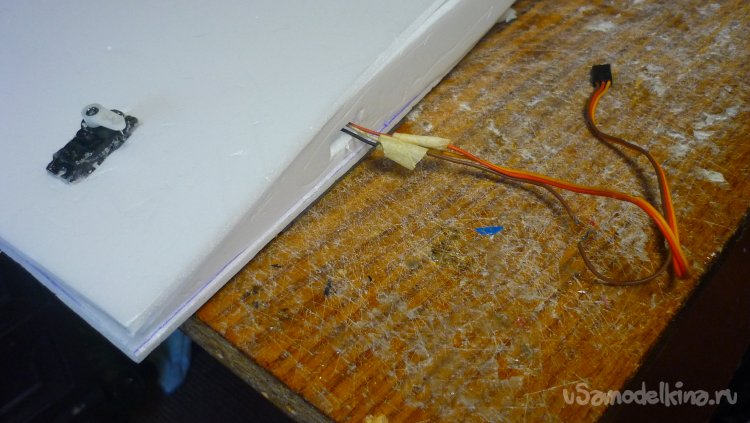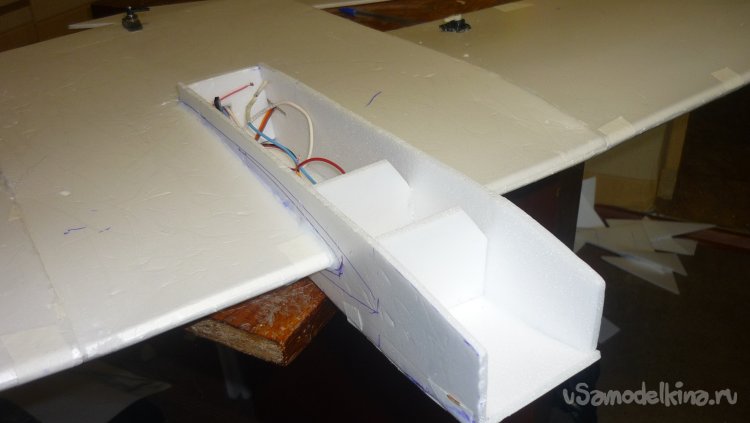 Перед монтажом внешней обшивки центроплана, прокладываю провода от сервоприводов.